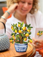 Each pop up flower card includes a small blank coordinating notecard. A mini tree that is simply the zest! This beautiful, mini arrangement of vibrant lemons and cheerful blossoms is nestled in a bed of moss with an ornate, ceramic-inspired white and blue pot. Inspired by the breezy seaside of Italy, this stunning Mini Lemon Blossom Tree makes for the perfect pick-me-up and lemon-aid.