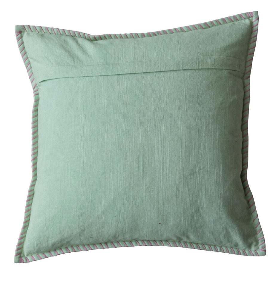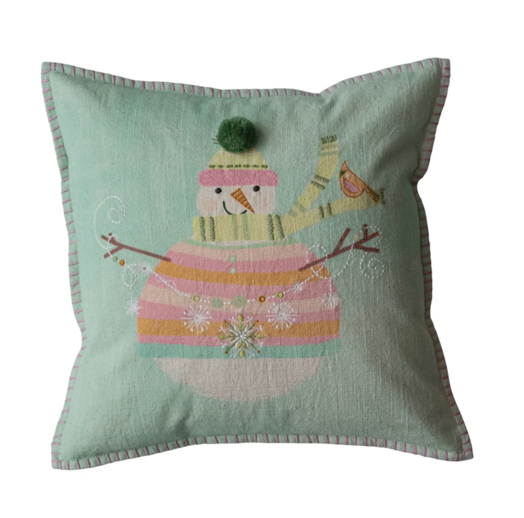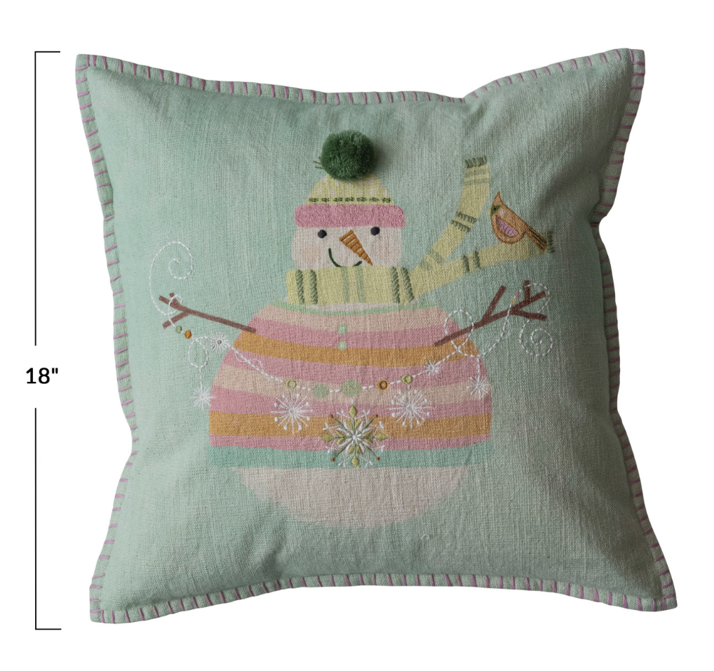 18" Square Cotton Printed Pillow w/ Snowman, Pom Pom, Hand-Embroidery & Blanket Stitch Edge, Multi Color ©
