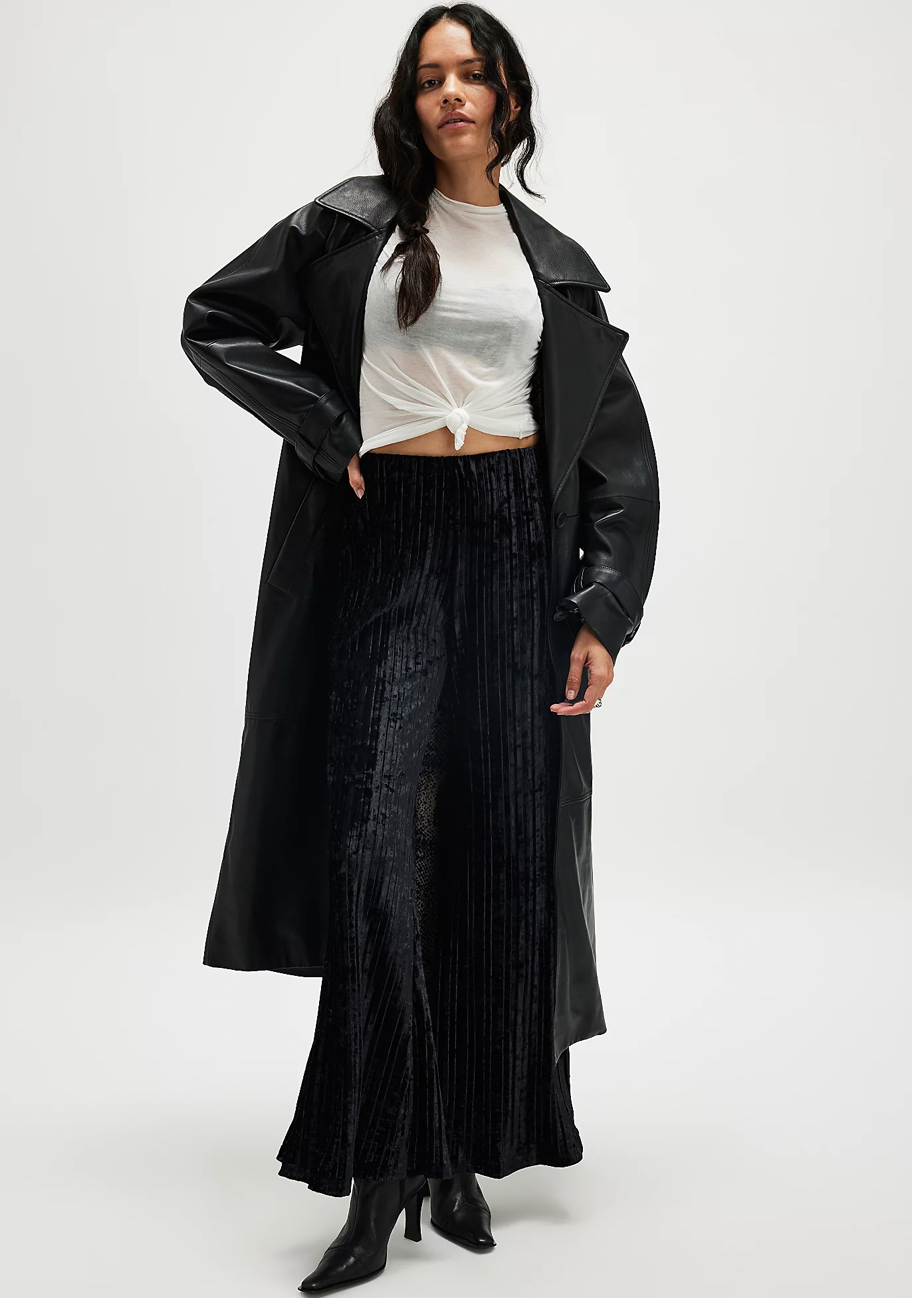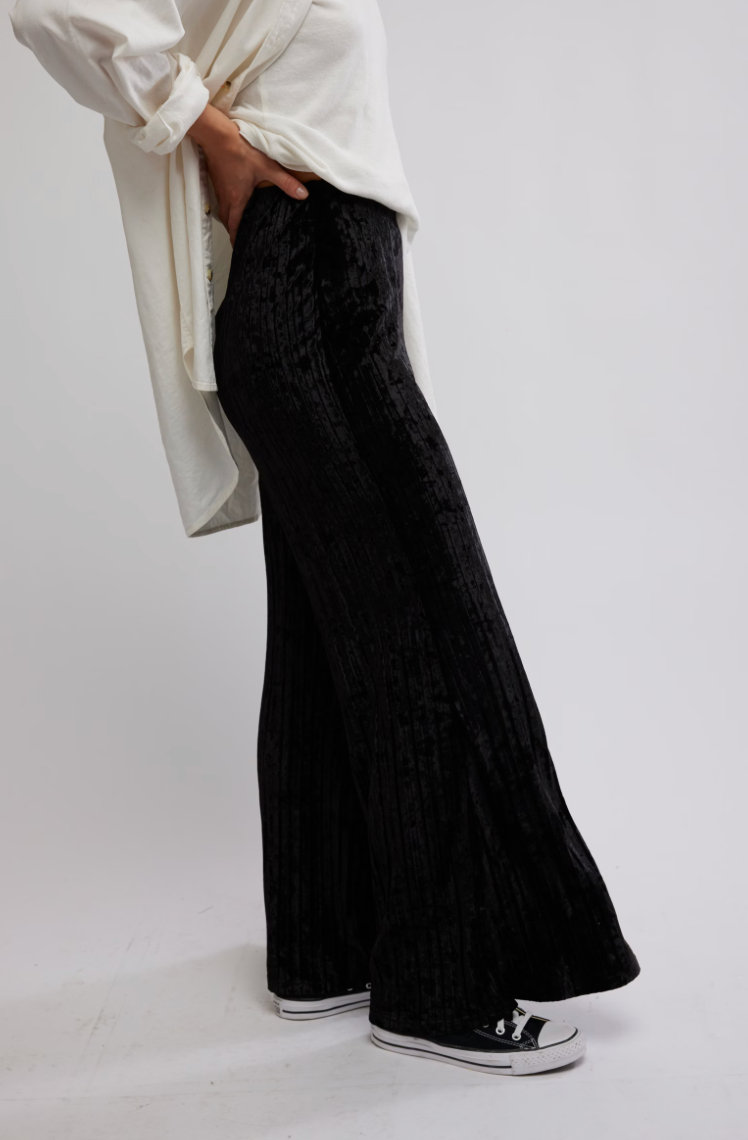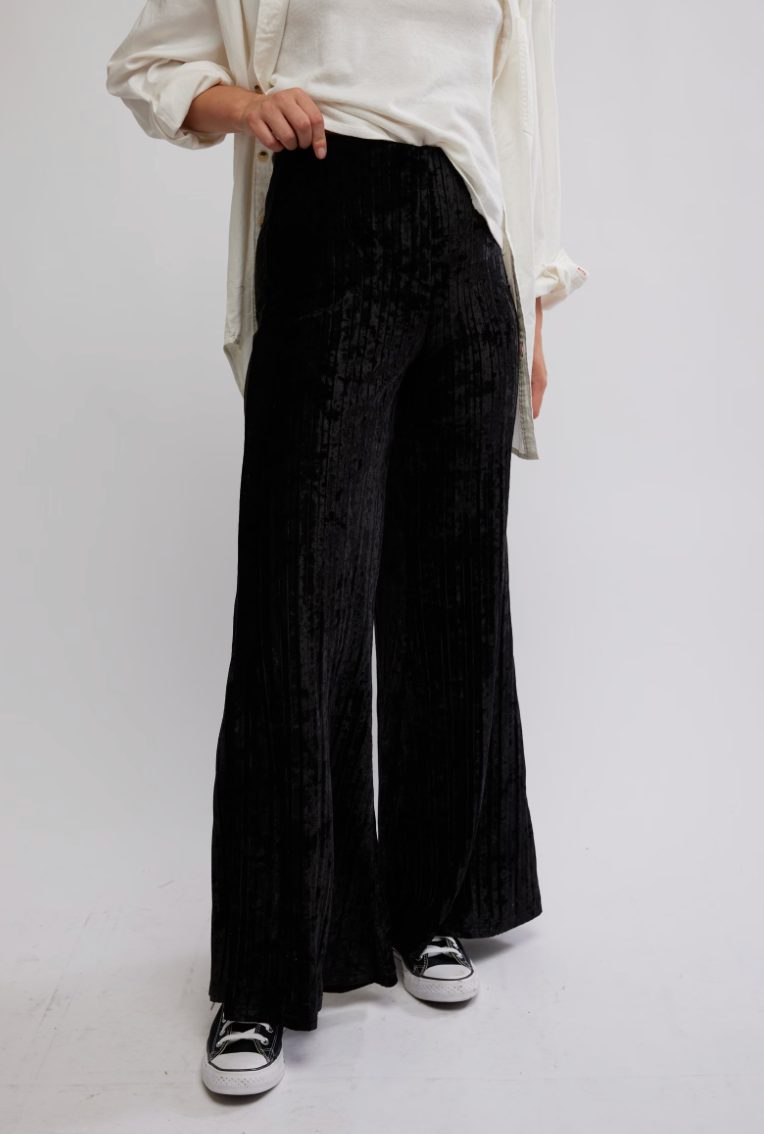 Features: Elastic waist for pull-on ease, pleating throughout, soft velvet fabrication