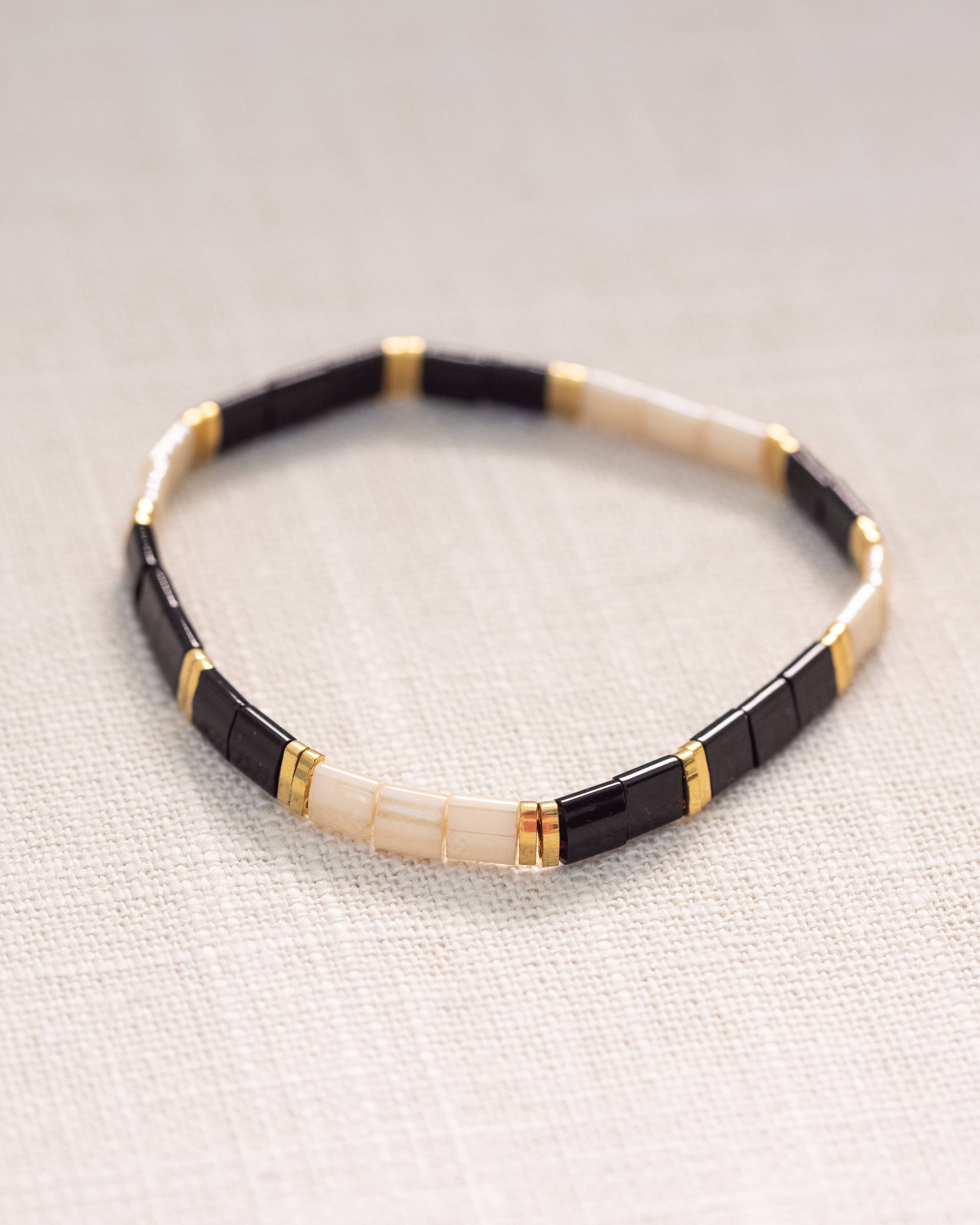 Handcrafted stretch bracelet made with delicate glass colored Tila beads and accented with 24k gold plated Tila beads. 6.5 inches, fits most, fit similar to friendship bracelet or a hair tie, not intended to be a bangle bracelet Designed in sunny Florida, made by artists in the USA.