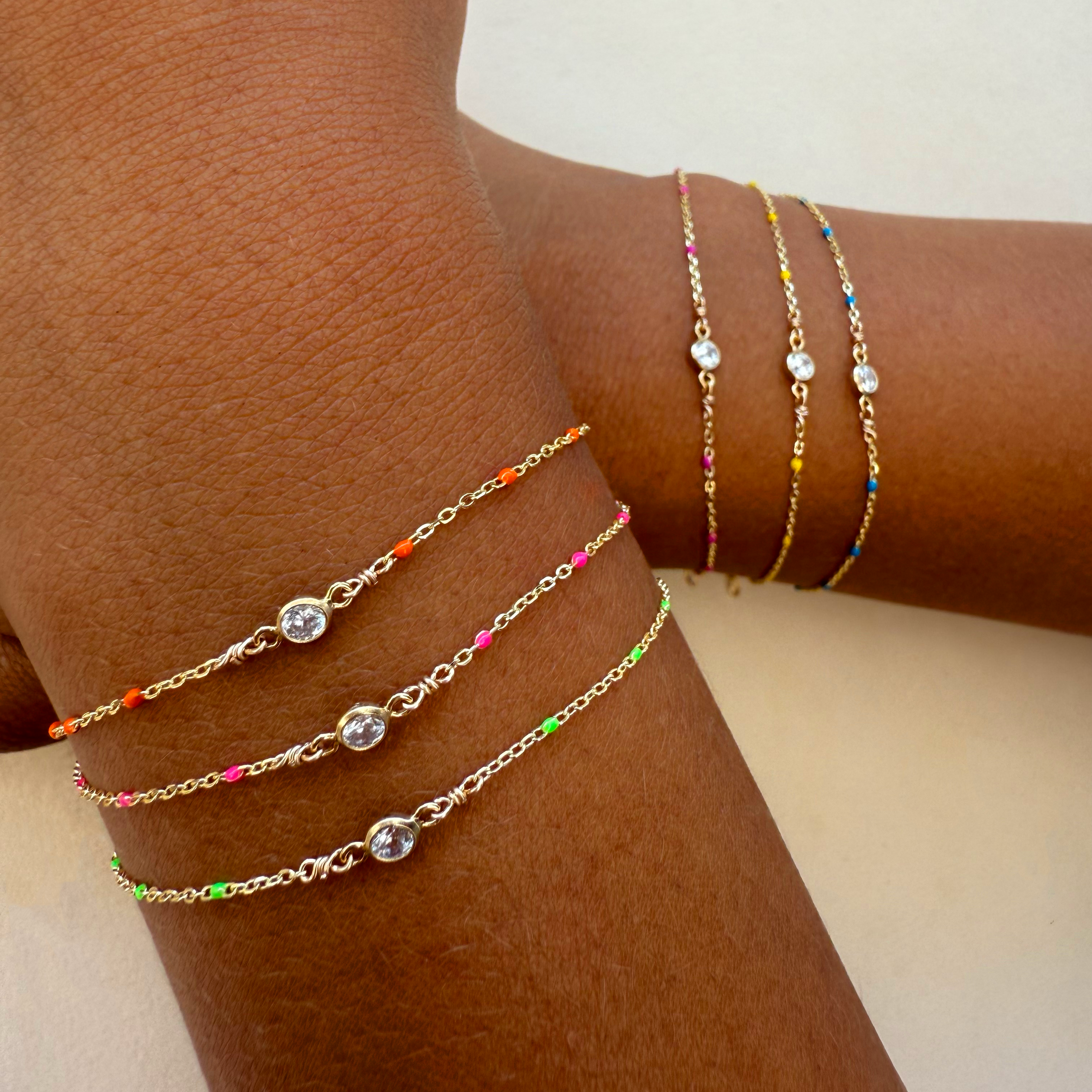 Material: Vermeil chain with enamel accents with gold filled bezeled CZ stone