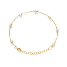 Very demure chain that is great for stacking. Freshwater pearl station chain. Made of 14k gold plated brass + coated to resist tarnish. Synthetic pearls.