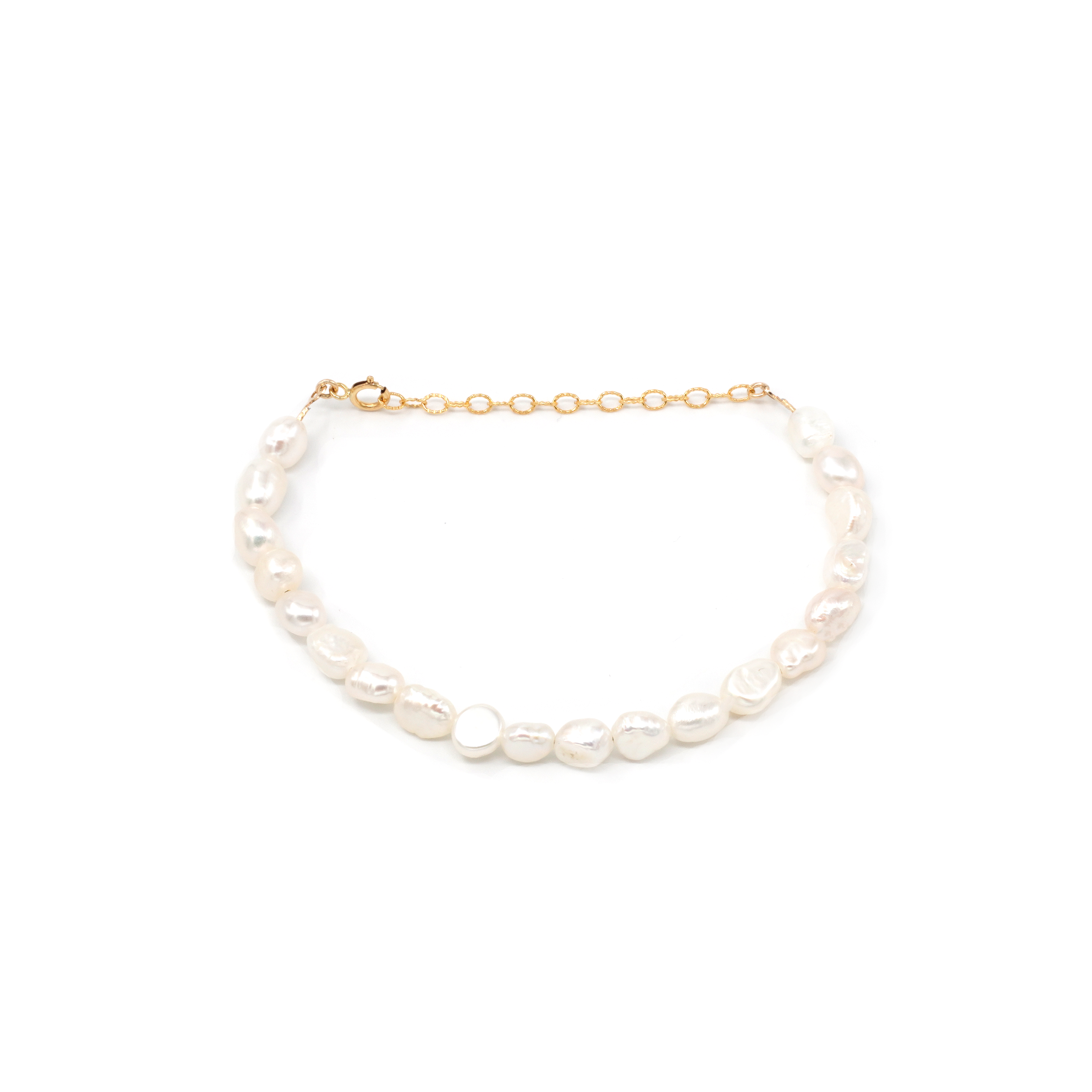 Material: Fresh water seed pearls Length: 5" chain with 1.5" extender *Size and shape of pearl may vary Made by hand in Southern California