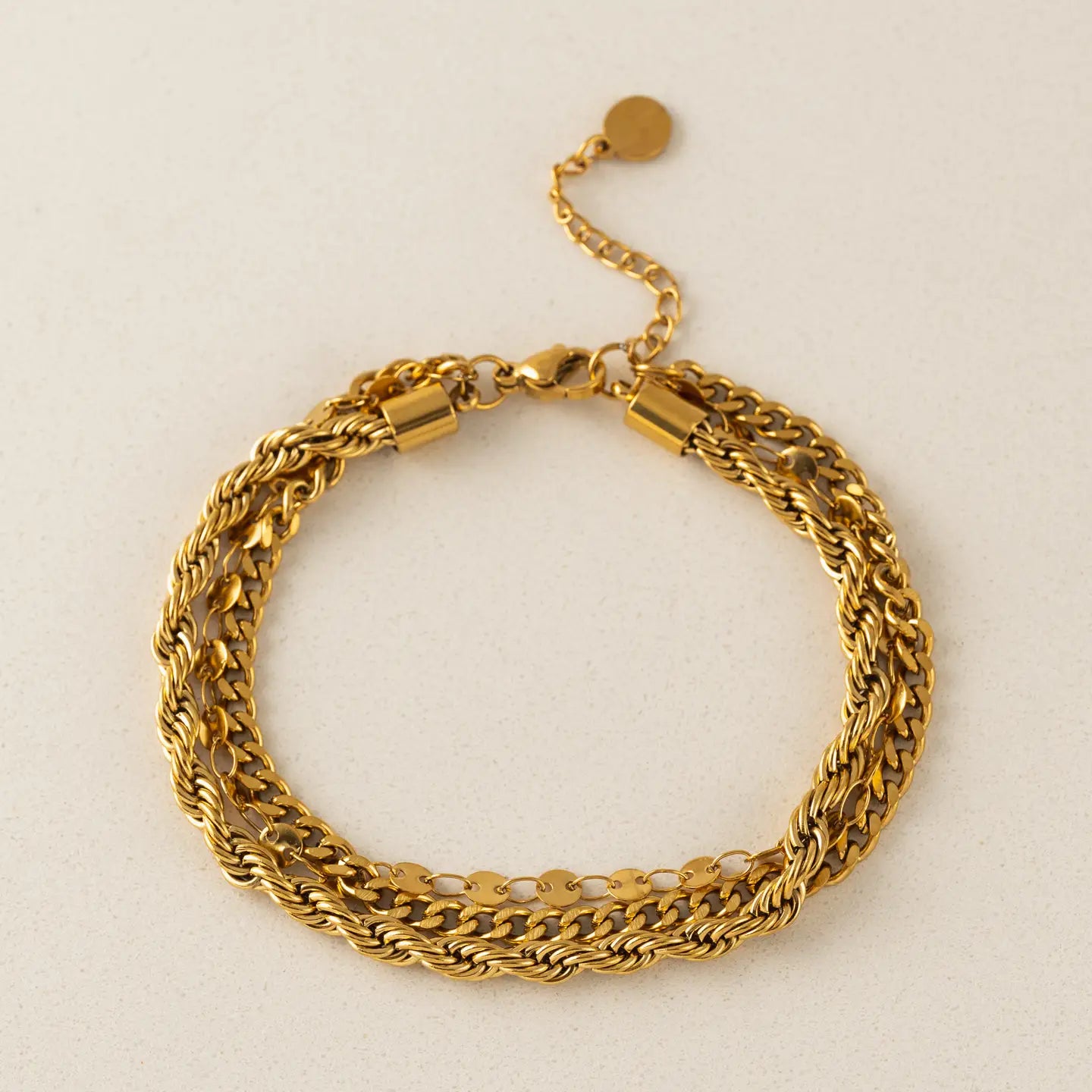 Designed to make everyday styling feel intentional, the Reef Layered Bracelet brings depth and confidence to the wrist with its stacked silhouette that feels bold yet effortless. The Reef Layered Bracelet is a link and chain bracelet crafted from stainless steel and finished with durable 18K gold PVD. Its layered construction creates the look of multiple bracelets in one, offering instant impact while remaining comfortable for daily wear. Perfect as an everyday bracelet for customers who want the visual interest of layered bangles and chain bracelets without the hassle of stacking. Key Features: * Multi-chain layered design for a bold, stacked look * 18K gold PVD coating for long-lasting shine * Lightweight feel despite its dimensional appearance * Adjustable length for a customized fit