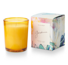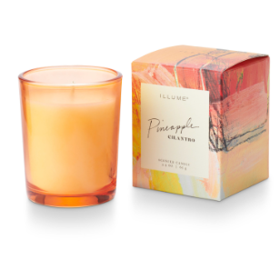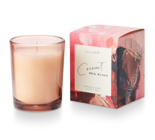 A limited edition tinted glass votive, tucked inside a gift-ready box featuring the abstract paintings of ILLUME founder,Lynette Reed.