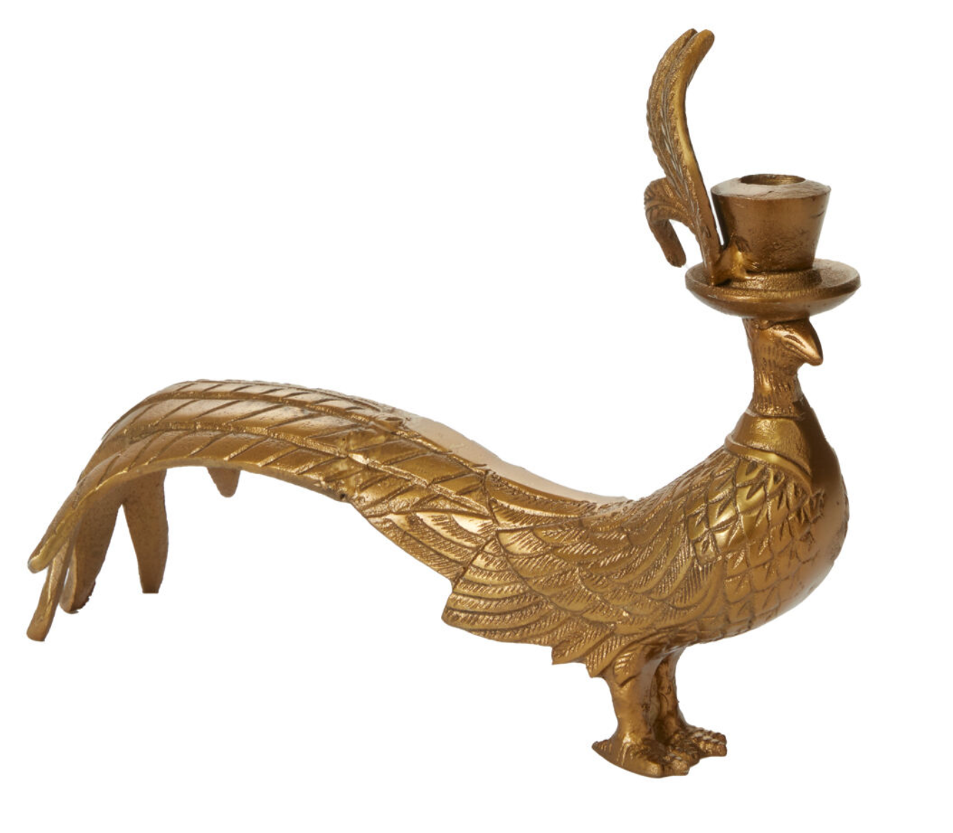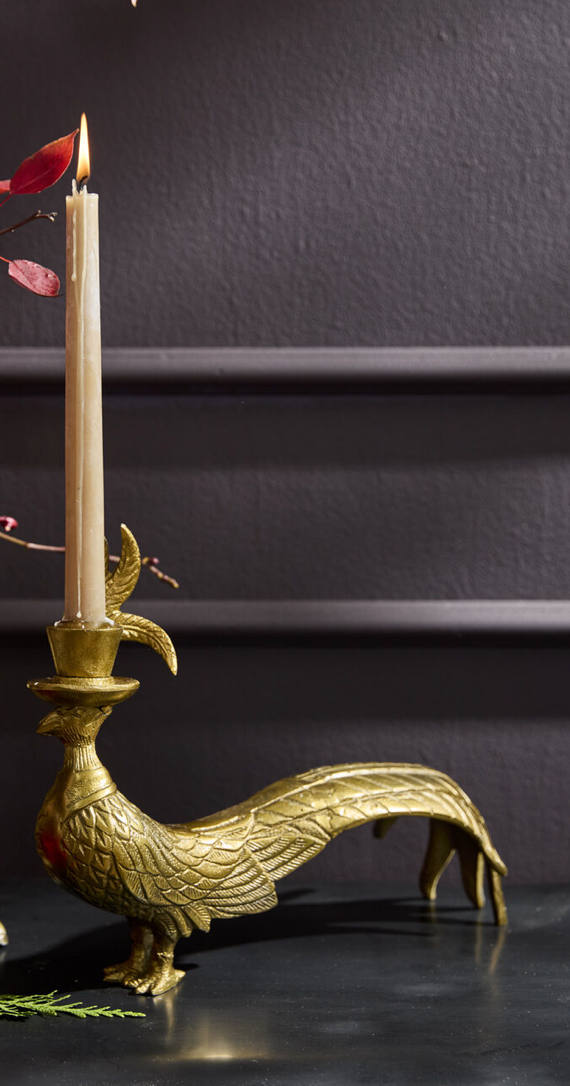 Designed by artist Jessica Heimstra, the Pheasant Candlestick Collection features a charming pheasant with full plumage and feathered hats. Crafted from recycled cast aluminum with an antique gold finish, each taper candlestick showcases a dimensional design with a candle opening in their hats.