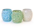 Bring a touch of ambiance to your living space with our Perforated Iron Votive Candle Holder. Available in three stunning colors - Blue, Green, and White - this exquisite piece adds a pop of color to any room. The intricate perforated design creates a mesmerizing display of light when candles are lit, making it perfect for cozy evenings or intimate gatherings. Handcrafted with care, this candle holder is both functional and decorative, making it a versatile addition to your home decor.