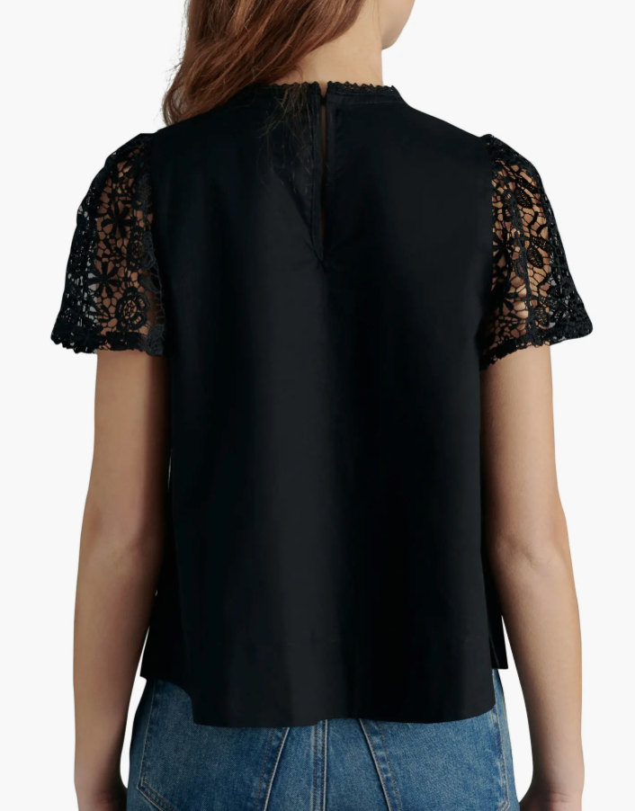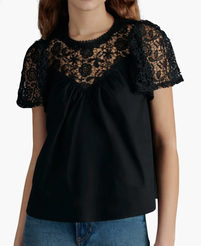 Add a pretty touch to even the most casual looks with a stretch-enhanced cotton top designed with an airy lace yoke and sleeves.