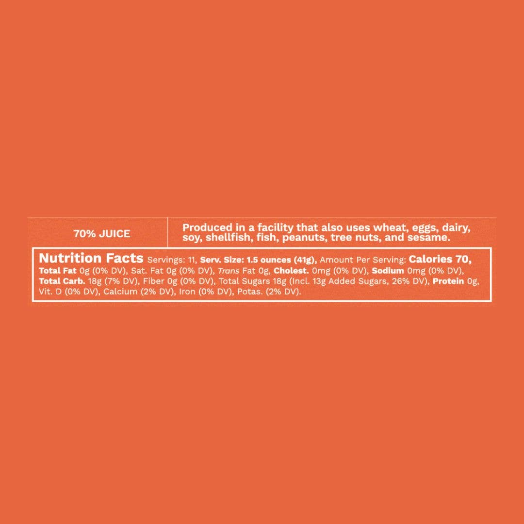 Ingredients: Water, Cane Sugar, Mango Juice Concentrate, Lime Juice Concentrate, Habanero Puree, Kosher Sea Salt