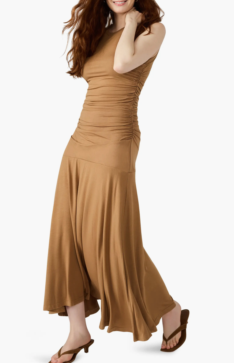 Ultrasoft and pleasantly carefree, this drop-waist maxi dress has ruched sides giving it lots of texture.