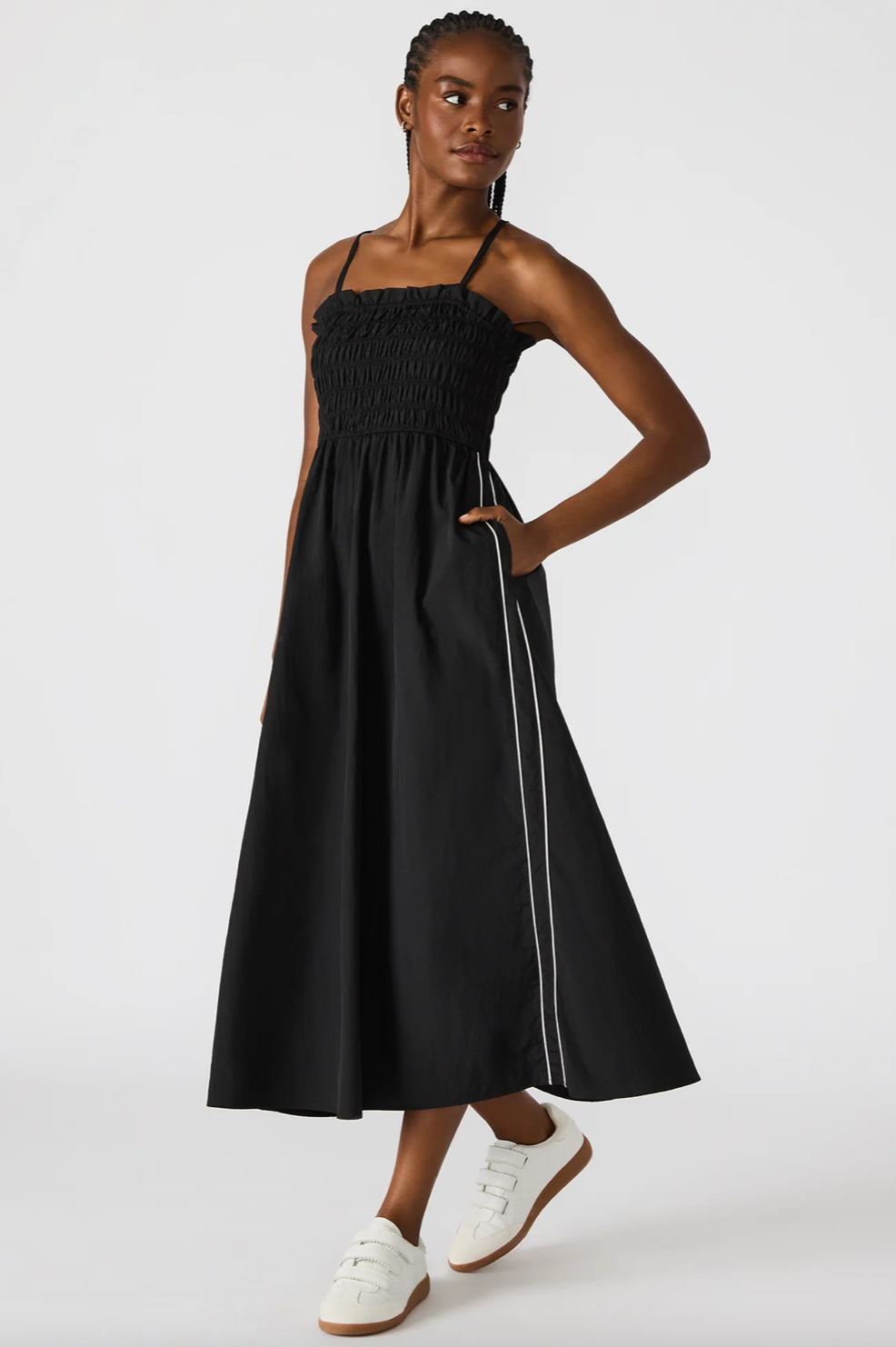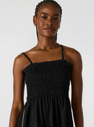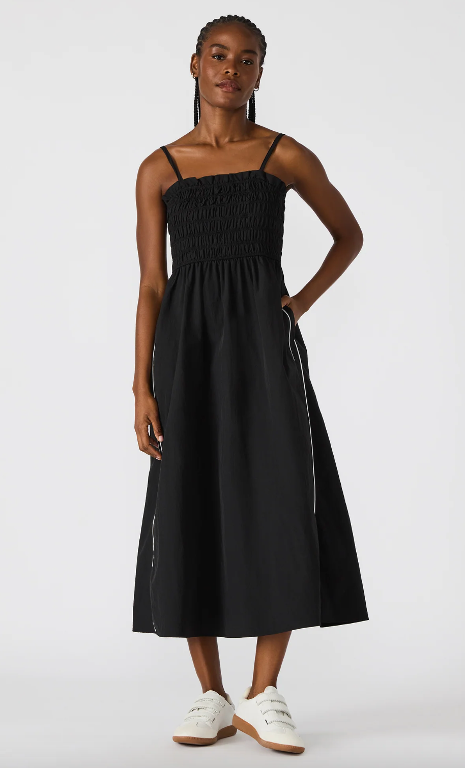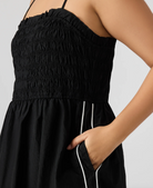 Expertly designed for comfort and style, the KIT dress is the perfect addition to your wardrobe. The flowy maxi dress features sleek stripe detailing, while the pull-on style and adjustable straps provide a customizable fit. The smocked top adds a touch of flair and versatility to this must-have piece.