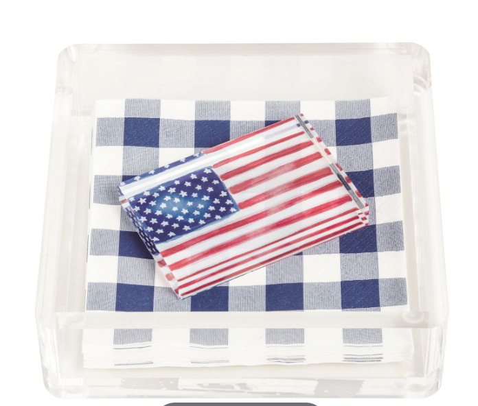 3-piece set. Pack of 12 paper cocktail napkins comes in acrylic display caddy with acrylic weight.