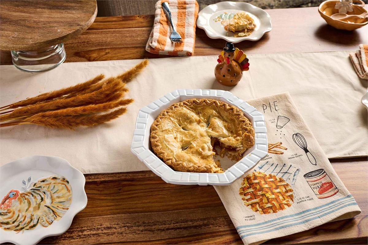 2-piece set. Ceramic pie dish. Comes with cotton ingredient hand towel. Kraft tag includes recipe.