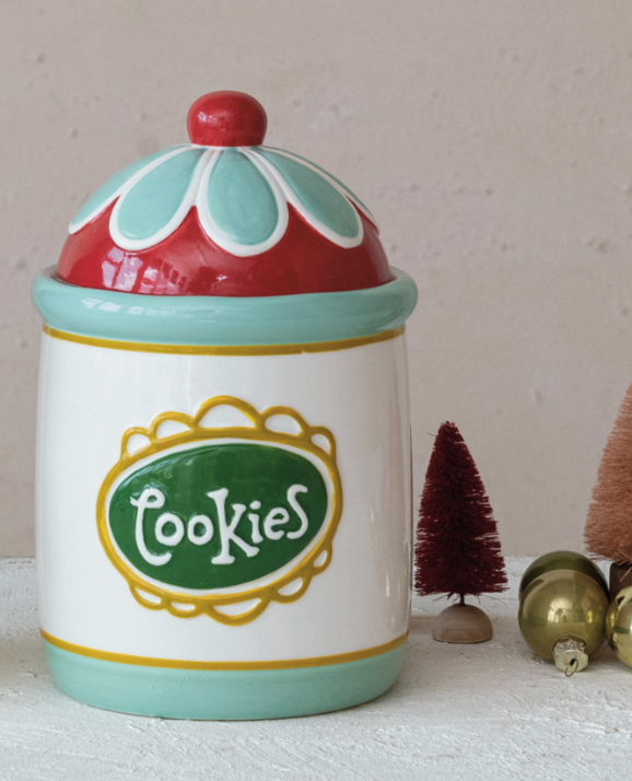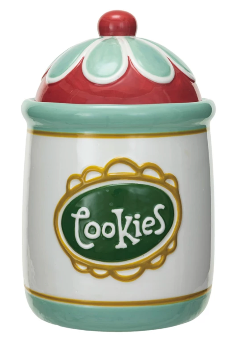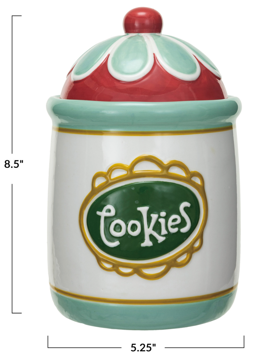 This round stoneware cookie jar features a multicolor design and the word "Cookies" on the front. The cookie jar has a bright and cheerful color scheme. It is ideal for storing and displaying homemade or store-bought cookies in a fun and colorful way. The cookie jar has a silicone seal on the lid that makes it easy to open and close and keeps cookies fresh and crunchy. The cookie jar is made of stoneware and silicone, which are durable, easy to clean, and microwave and dishwasher safe. It measures 5.25 inches in diameter and 8.5 inches in height. This stoneware cookie jar will bring joy and style to the kitchen. A round stoneware cookie jar with a multicolor design and the word "Cookies" on the front. Perfect for storing and displaying homemade or store-bought cookies in a fun and colorful way. The cookie jar has a silicone seal on the lid to keep cookies fresh and crunchy.