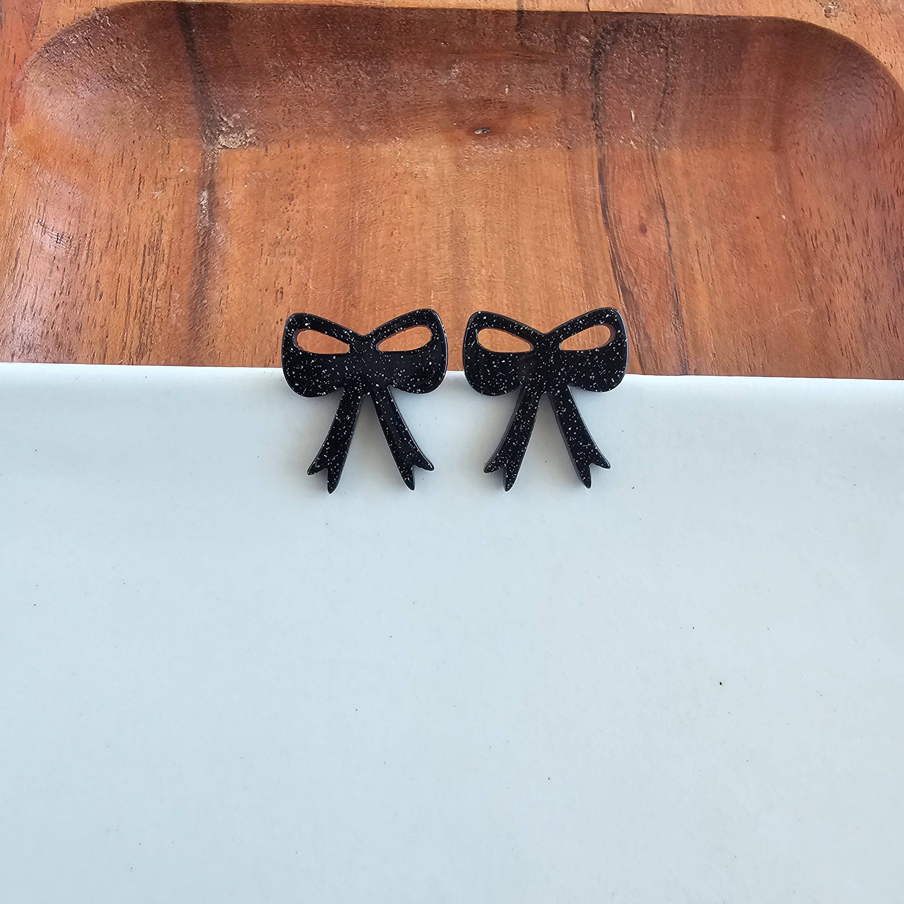 Style meets spooky with these black glitter bow studs. Get ready to slay the day with these wickedly cute earrings. * Hypoallergenic stainless steel posts * Lightweight and durable glitter acrylic MSRP $17