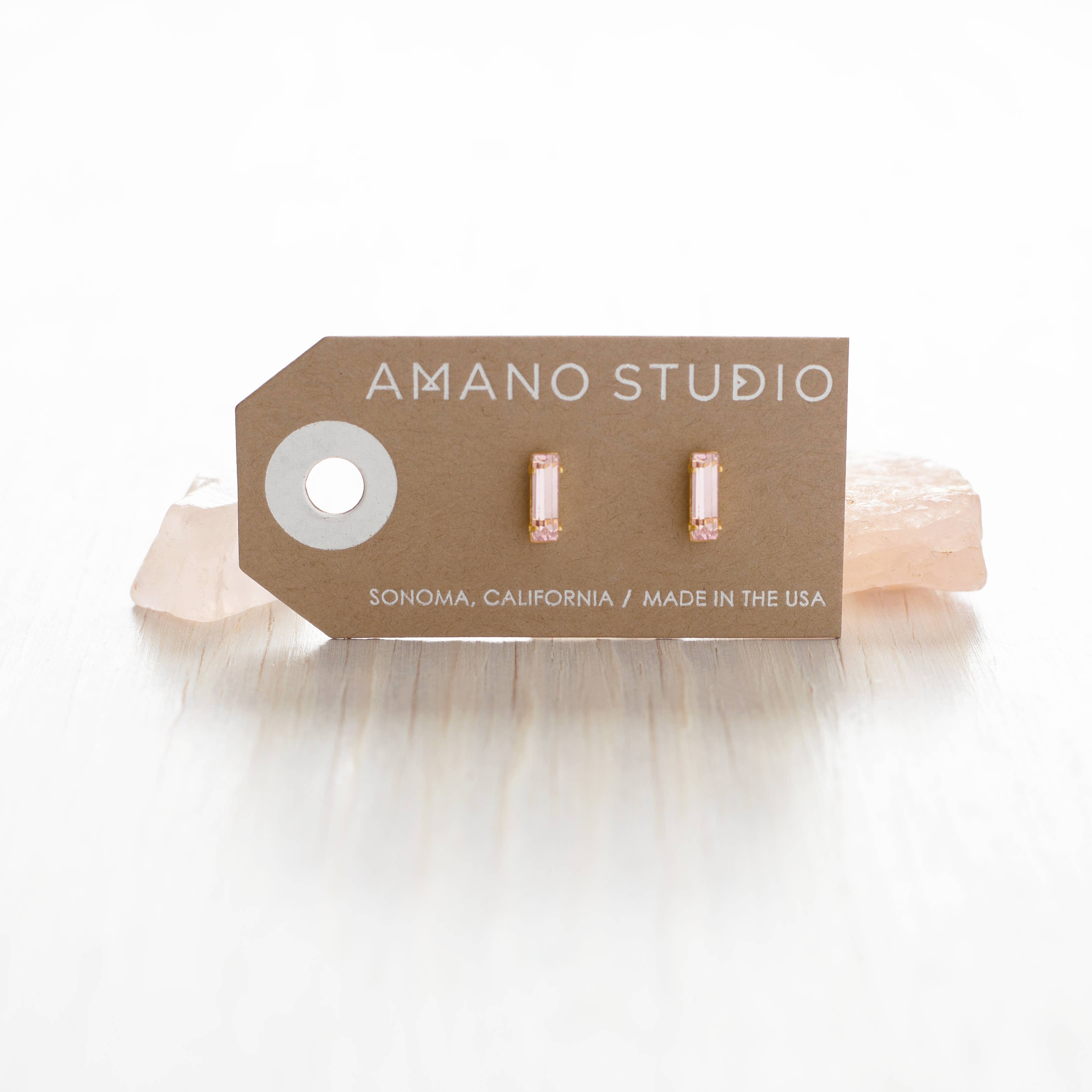A new color addition to our best selling studs! 3x10mm Czech crystal baguette. Setting is 24k gold plated brass 7-10 mil heavy gold. Made in the USA.