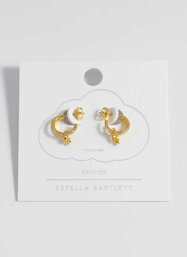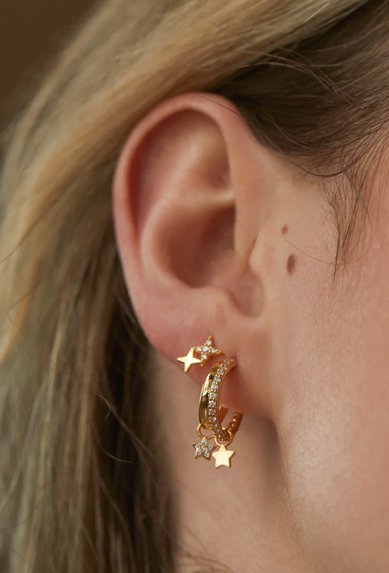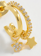 Go for a celestial look with our Duo Pave Star Hoops. Featuring two mini hoops adorned with tiny stones and dainty star drop charms, these earrings add sparkle to your style. Wear with our CZ Moon Necklace for a complete look.