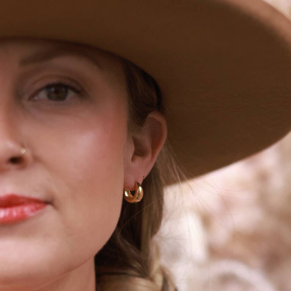 These "one touch" snap on huggie hoops are available in 15mm (small) and 20mm (medium). They are an easy, vintage look that stacks well with other pieces or they have a sleek modern look all on their own.