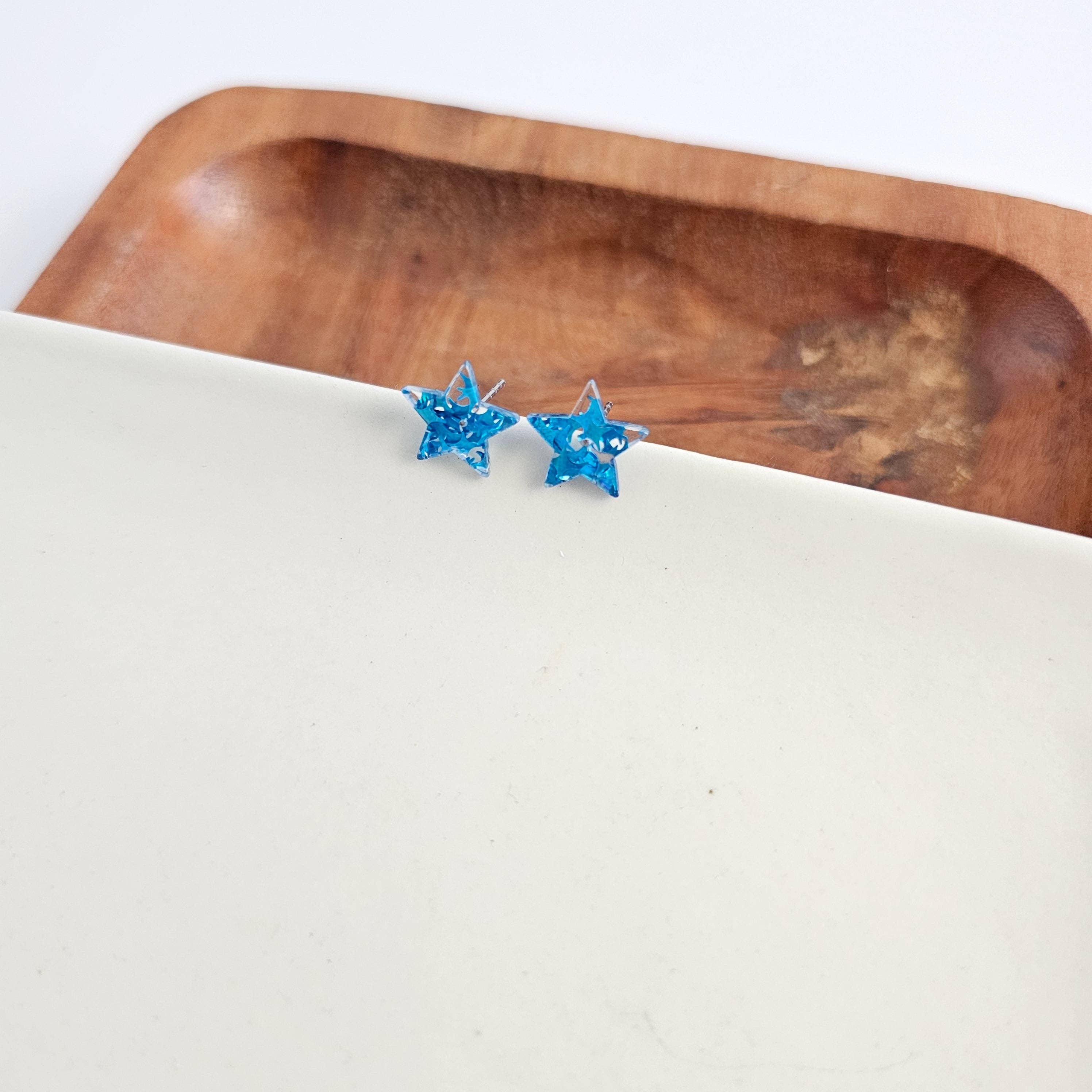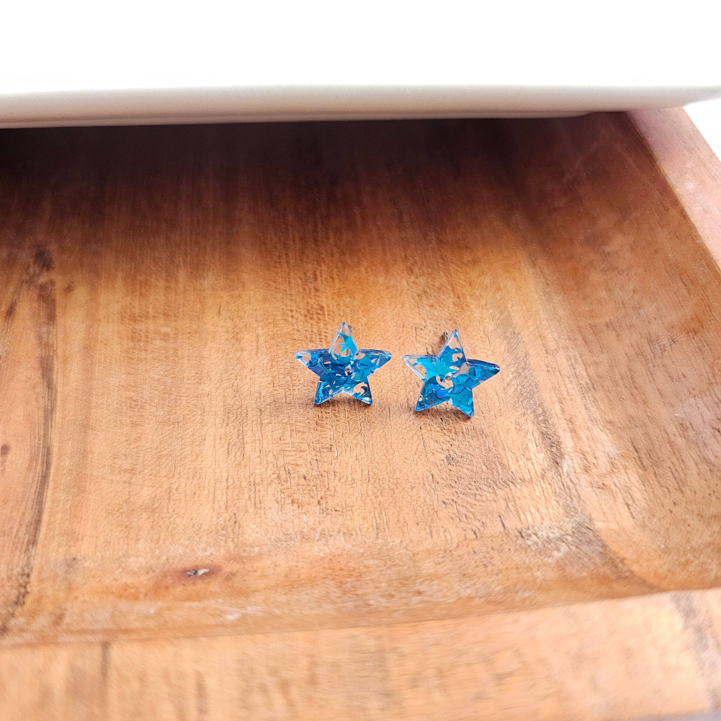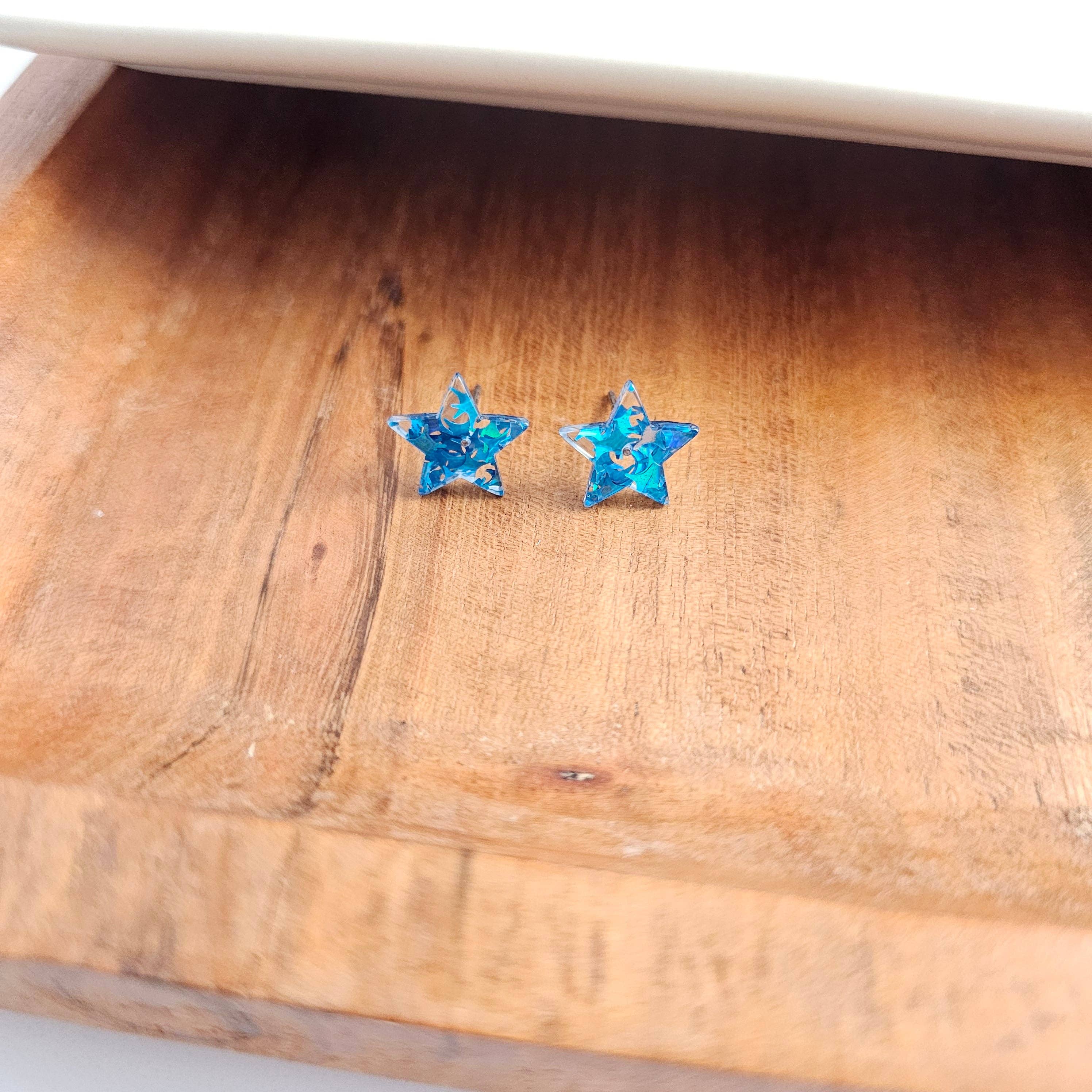 Our Star Studs are our classic dainty star-shaped stud earrings featuring a blue glitter confetti that can be worn for patriotic festivities or all year long. * Hypoallergenic stainless steel posts * Durable and lightweight acrylic * 12mm star size
