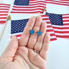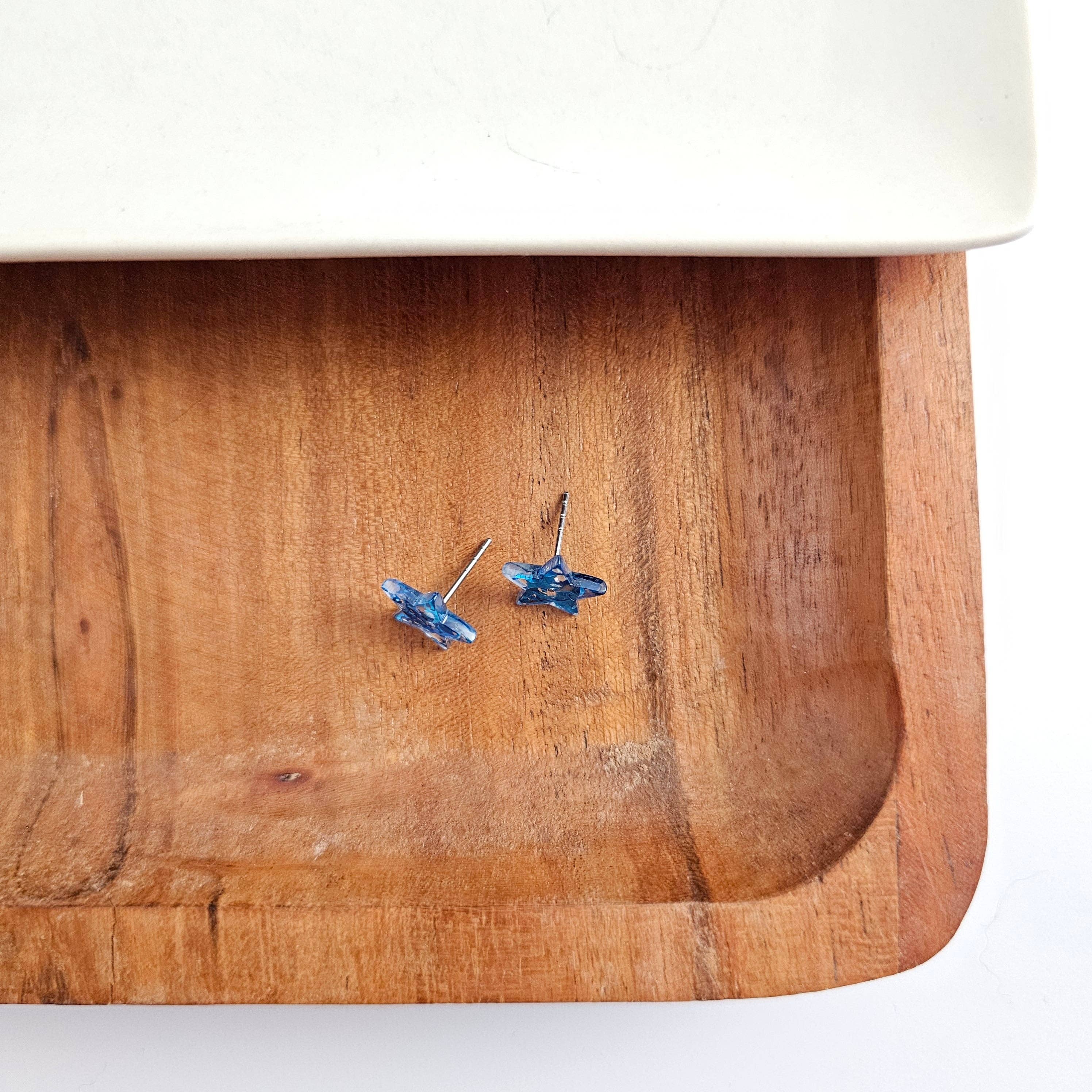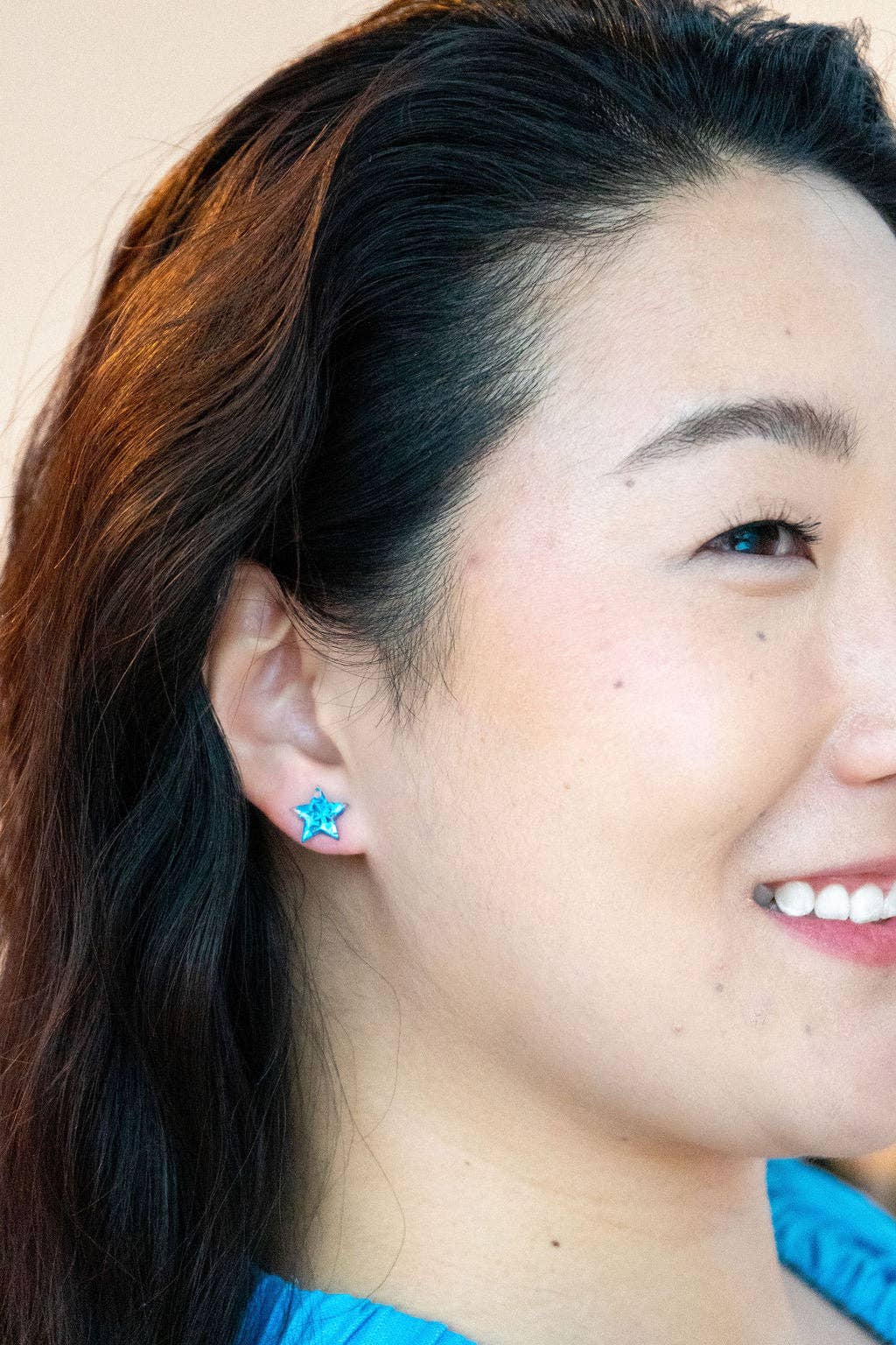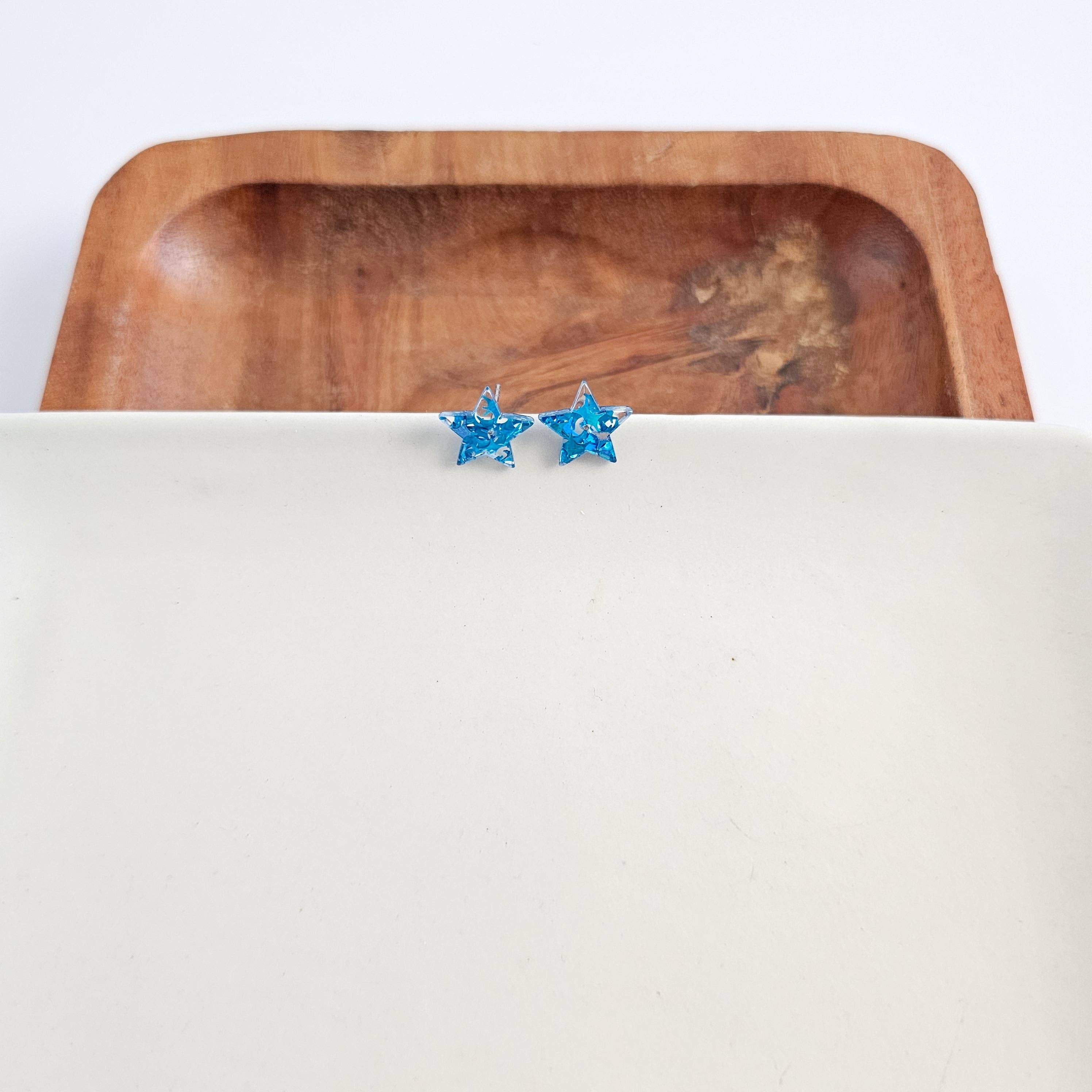 Our Star Studs are our classic dainty star-shaped stud earrings featuring a blue glitter confetti that can be worn for patriotic festivities or all year long. * Hypoallergenic stainless steel posts * Durable and lightweight acrylic * 12mm star size