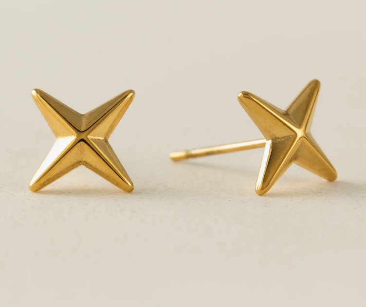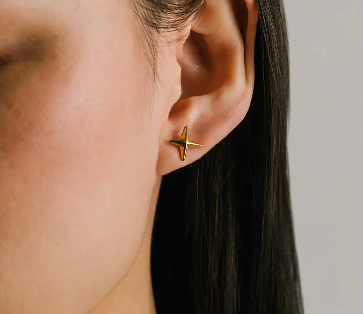The Starboard Stud Earrings bring a bold yet refined accent to everyday styling with a sculptural star silhouette rendered in polished gold-tone metal. The Starboard Stud Earrings are star-shaped stud earrings crafted from stainless steel and finished in 18K gold PVD for a smooth, high-shine surface. Designed to offer lasting wear and lightweight comfort, these studs provide a confident statement while remaining easy to style daily. Perfect as a minimalist statement stud for style-conscious customers who want sculptural gold earrings that elevate both casual and dressed-up looks. Key Features: • Sculptural star-shaped stud design with polished finish • Compact 10 mm size for subtle statement wear • Smooth edges for comfortable, all-day use • Secure post backing for reliable fit Construction & Materials: • Made In: China • Materials Used: Stainless Steel, 18K Gold PVD • Dimensions: 10 mm • Finish: High-polish gold PVD • Closure: Post back
