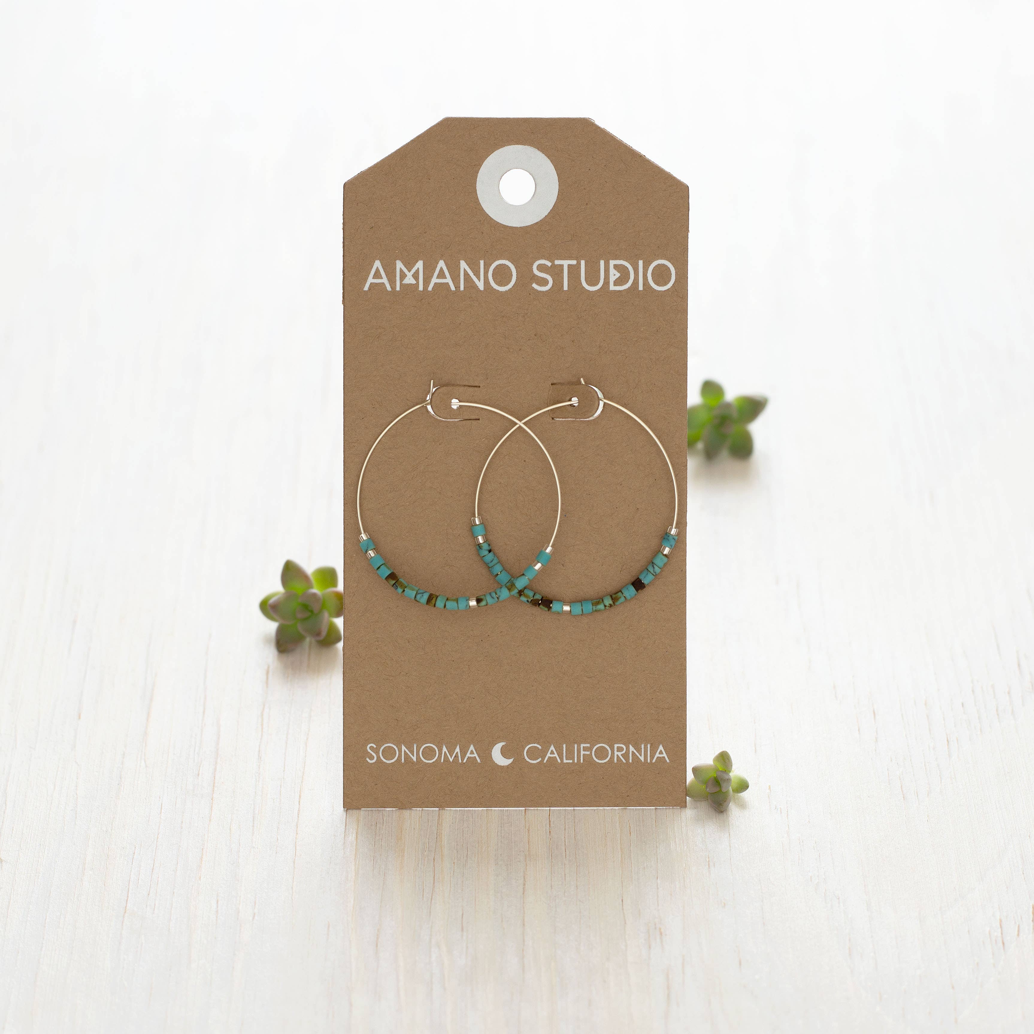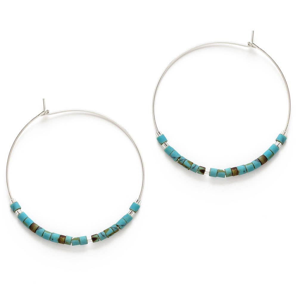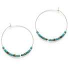 These 1.5" sterling silver hoops have a great South West look and turquoise is always a summer favorite. Designed and assembled in our Sonoma California studio.