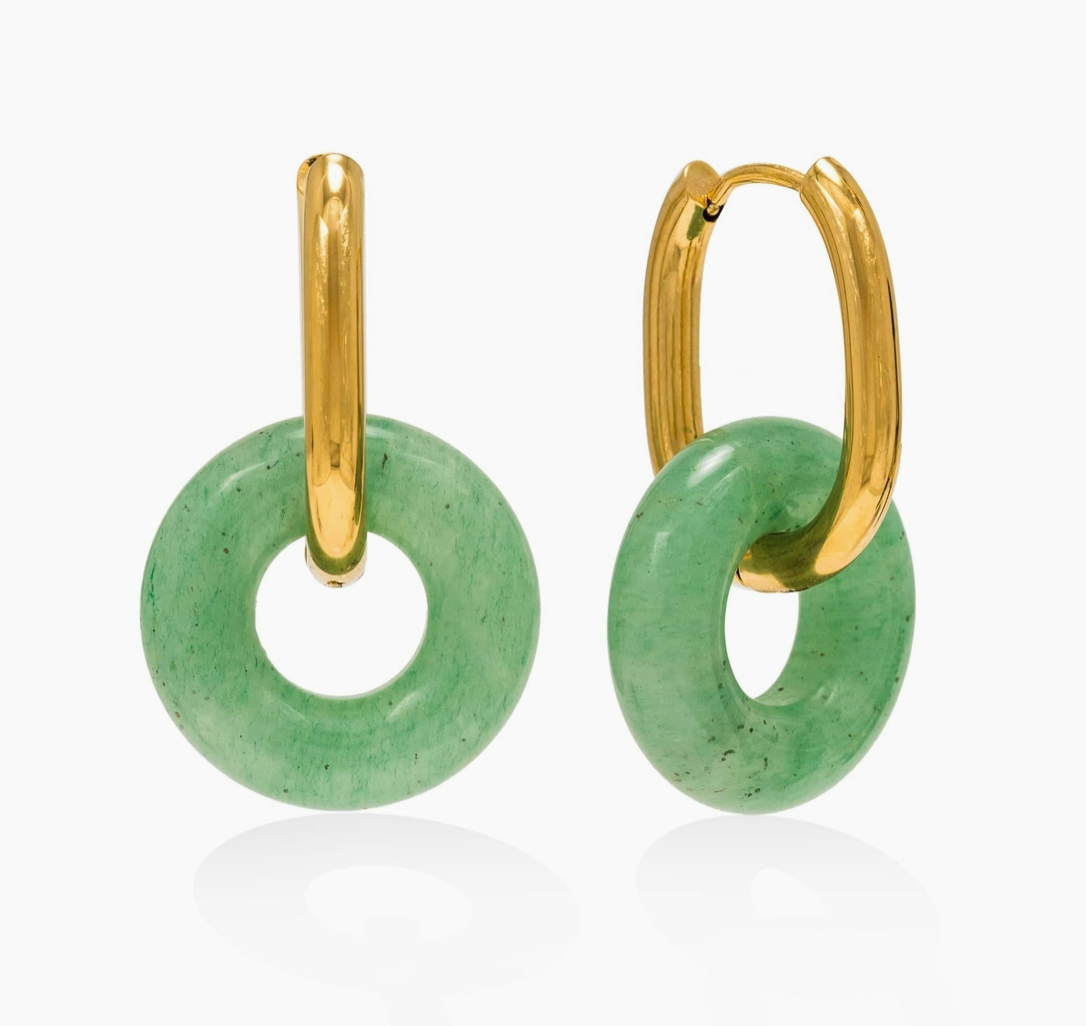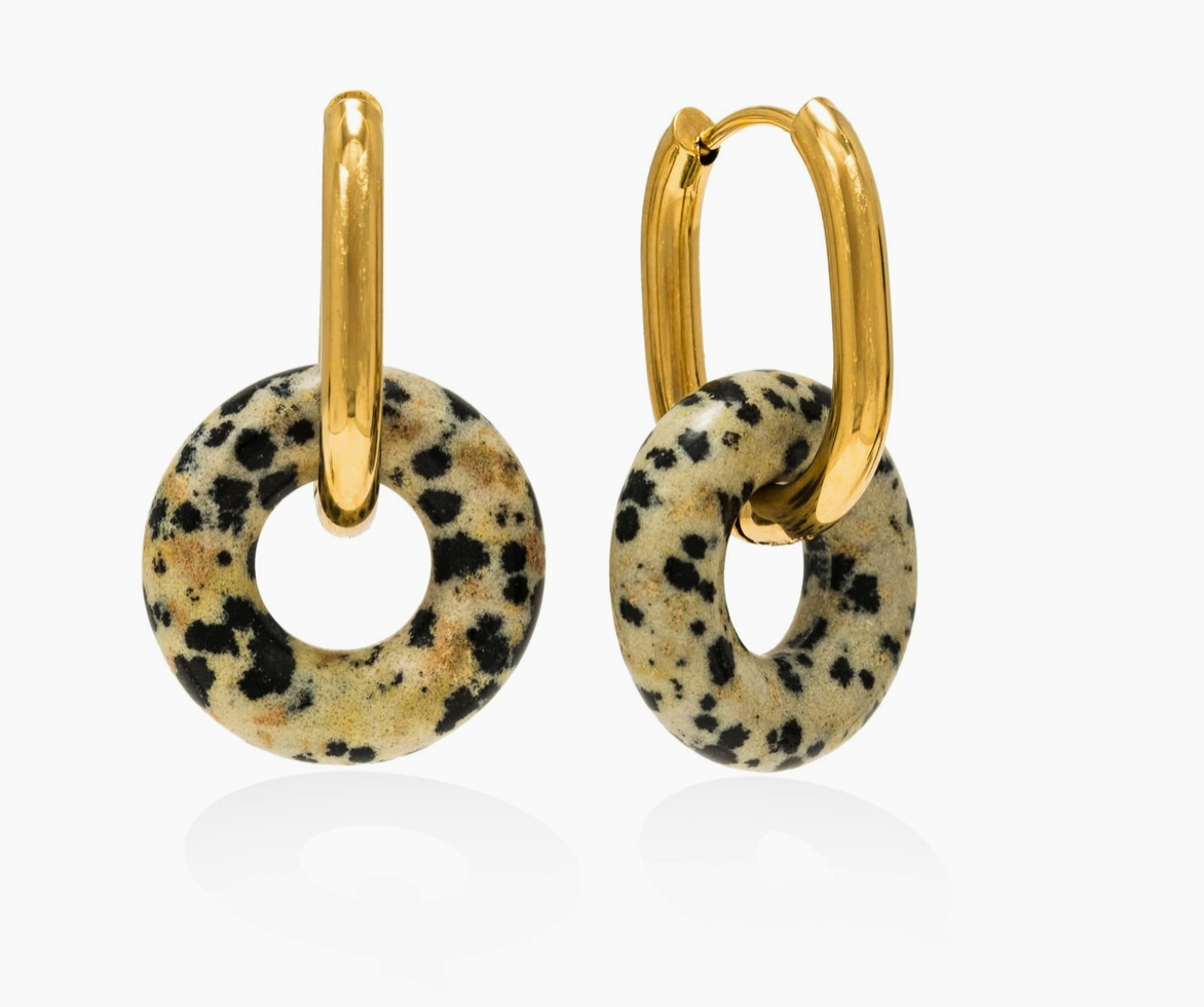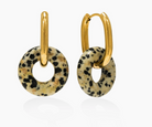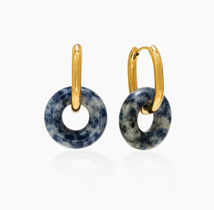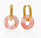 A modern statement hoop designed with removable stone-look accents, the Thames Hoop Earrings bring bold color and sculptural contrast to everyday styling. The Thames Hoop Earrings feature a 22 mm hoop crafted from stainless steel with an 18K gold PVD finish, paired with a 20 mm circular resin charm in marbled colorways inspired by natural stone. Designed to add visual interest and versatility to outfits while remaining lightweight and comfortable for extended wear. Perfect as a statement earring option for customers who want bold yet wearable hoops for everyday outfits, events, and elevated casual styling. Key Features: • 22mm gold-tone hoop with removable 20mm circular resin charm • Stone-look resin accents inspired by natural color variations • Lightweight construction for comfortable all-day wear • Polished hoop silhouette with smooth, rounded profile • Designed for easy styling from day to night Construction & Materials: • Made In: China • Materials Used: Stainless Steel, 18K Gold PVD, Resin • Hoop Diameter: 22mm • Charm Diameter: 20mm • Finish: Polished gold-tone hoop with marbled resin accents