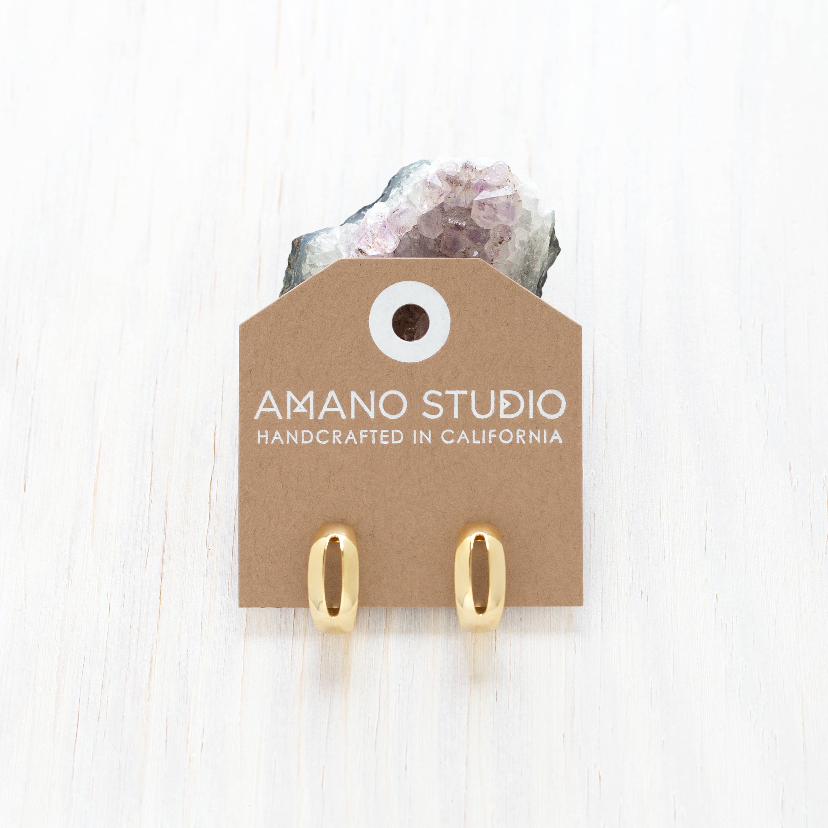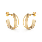This oval shaped hoop has an interesting twist: a cut out. They measure 3/4" in length. They have surgical steel posts and are made of 14k gold plated brass. They are fabricated from vintage molds. They were originally in the market in the early 80's! 100% made in the USA.