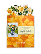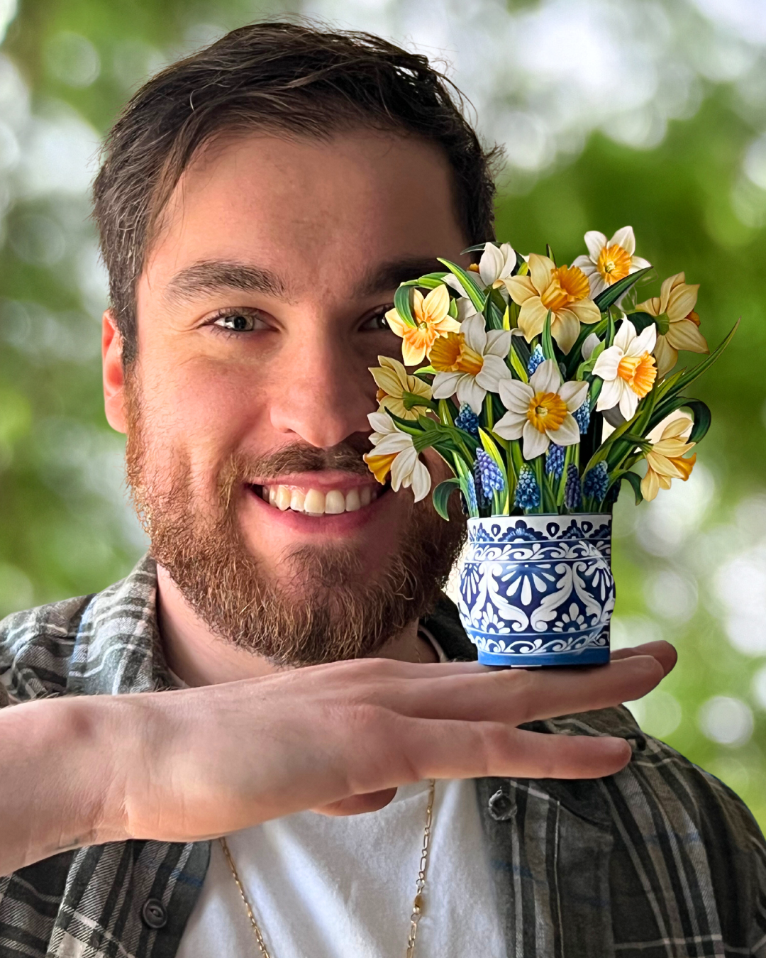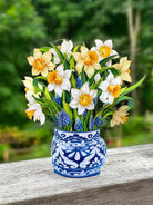 Each pop up flower card includes a small blank coordinating notecard. Our mini pop-up bouquet of English Daffodils features a delightful assortment of grape hyacinth buds and yellow and cream daffodil blossoms! Abundant in gardens across the English countryside, this charming classic is a symbol of hope, healing, and fresh beginnings Presented in an ornate paper vase inspired by English earthenware, this elegant gesture is perfect for all occasions. Easy to care for and long-lasting, these forever flowers will continue to cheer on your special someone for many years to come.