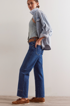 Features: Zip fly and button closure, five-pocket design, ankle-length inseam with frayed hem, utility seaming throughout