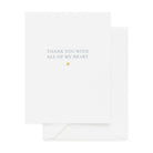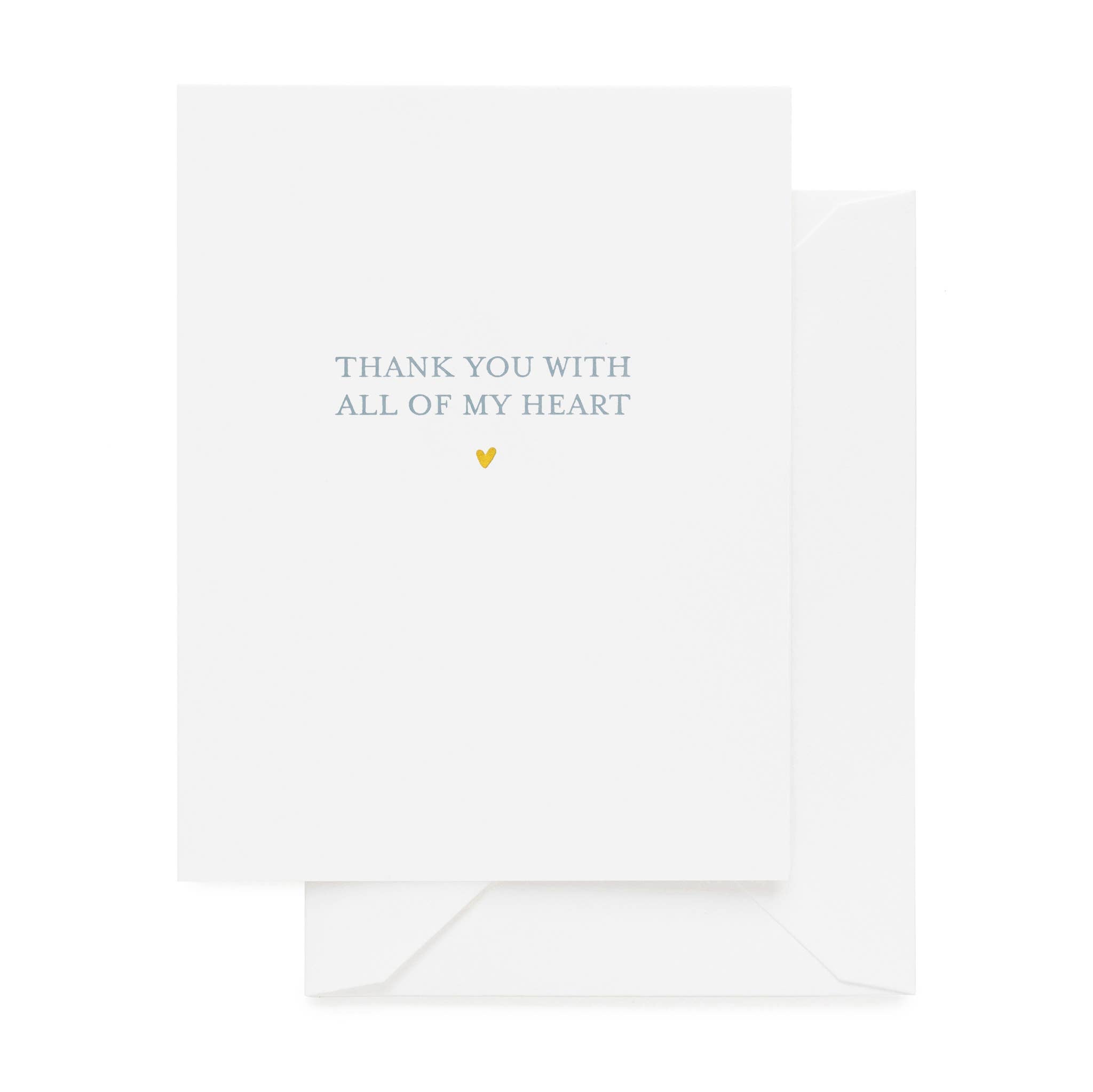 Our With All of My Heart card is letterpress printed by hand on antique machinery. Gold foil and pale blue ink on crisp white paper, paired with a crisp white envelope. Folded card, blank inside.