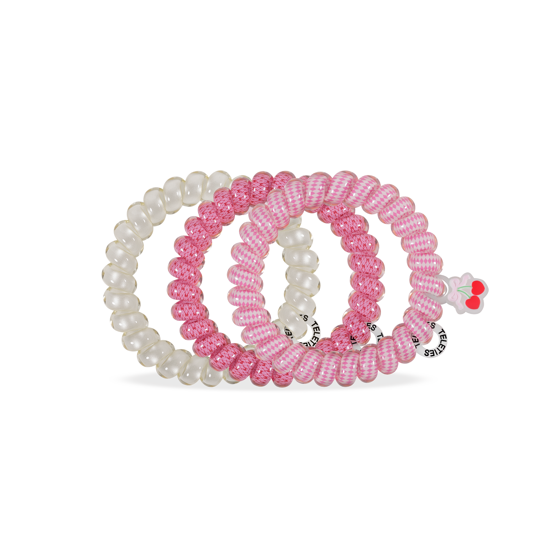 Cherry Bomb Large Hair Ties in Pink offer a strong grip without damage, doubling as a chic wrist accessory when not in use. Your new favorite hair essentials all year round. Strong grip, no rip design for all-day hold Doubles as a stylish bracelet Durable and waterproof for all occasions Gentle on hair—prevents breakage, headaches, and creases Sold in packs of three.