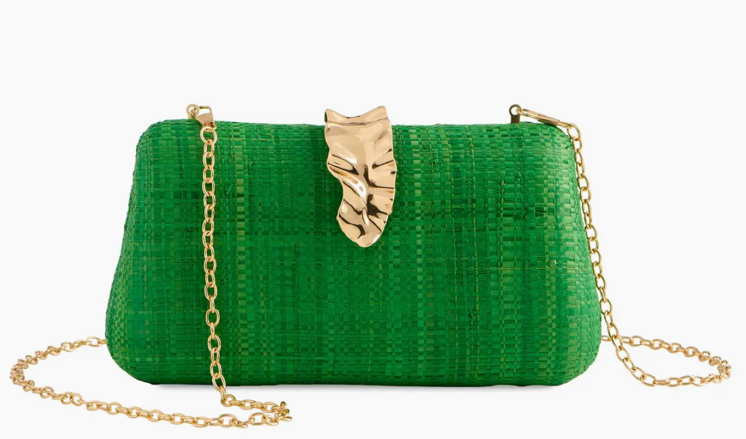 L 8.25" x W 2" x H 4.5"; chain 23"; raffia; gold hardware; detachable cross-body chain; magnetic frame closure