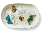 The Oval Metal Trinket Tray features archival butterfly illustrations with botanical accents. Use it to hold jewelry, display perfumes, or as a desk accessory tray.