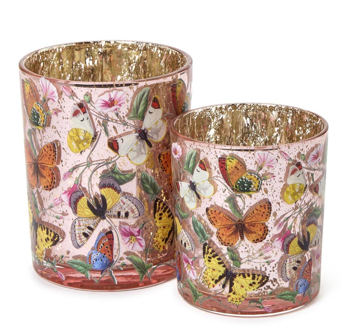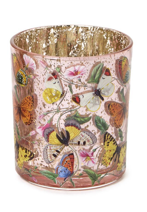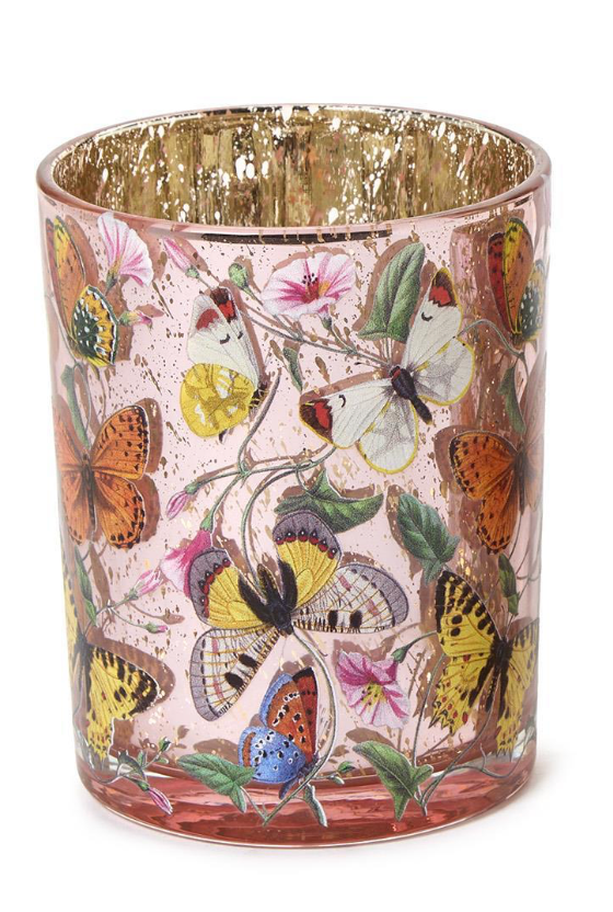 Transform any space into a garden delight with our \Butterfly Silhouette Antiqued Tealight/Votive Candleholders. Crafted with delicate precision, these glass candleholders bring a touch of whimsical charm to your home decor. Perfect for creating a cozy ambiance during evenings, they effortlessly elevate your living room or bedroom. Handcrafted to perfection, these candleholders are a true work of art.