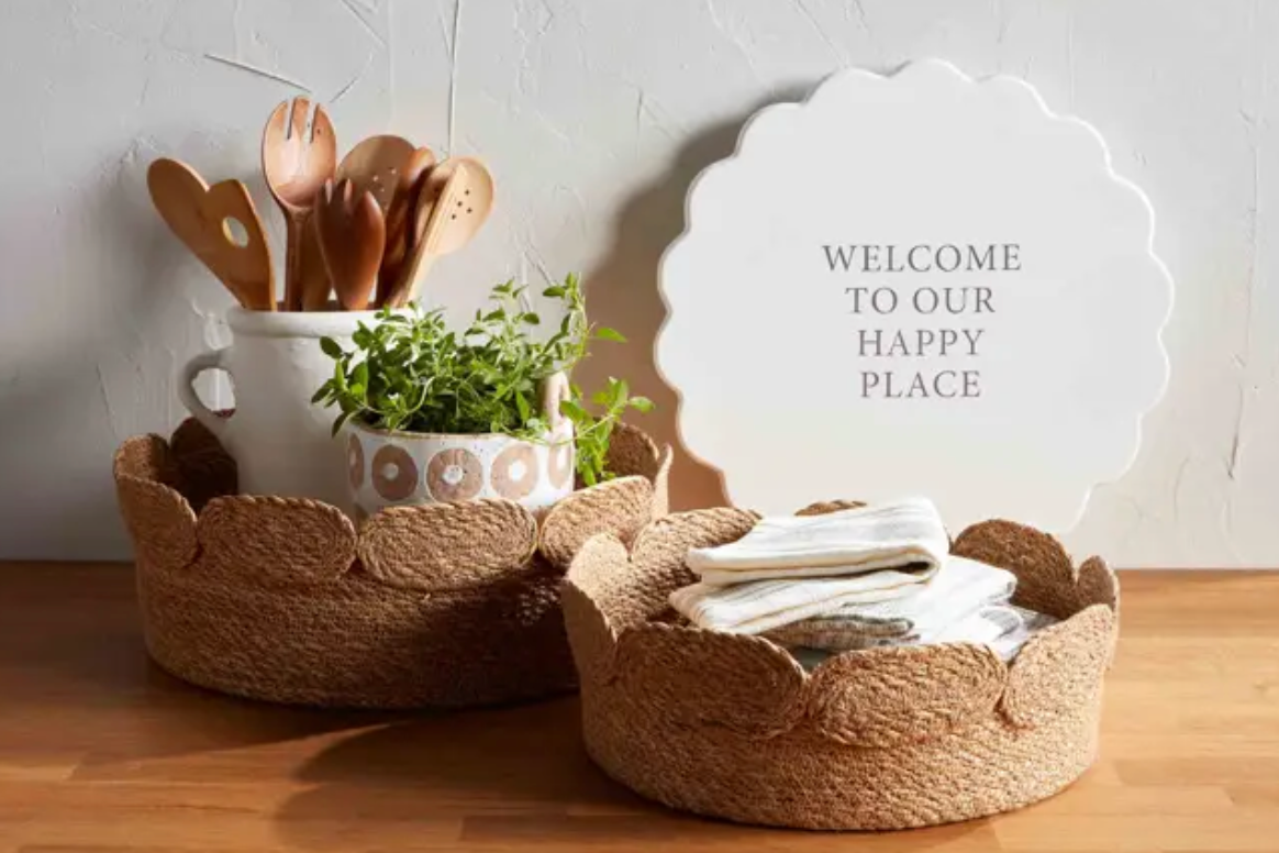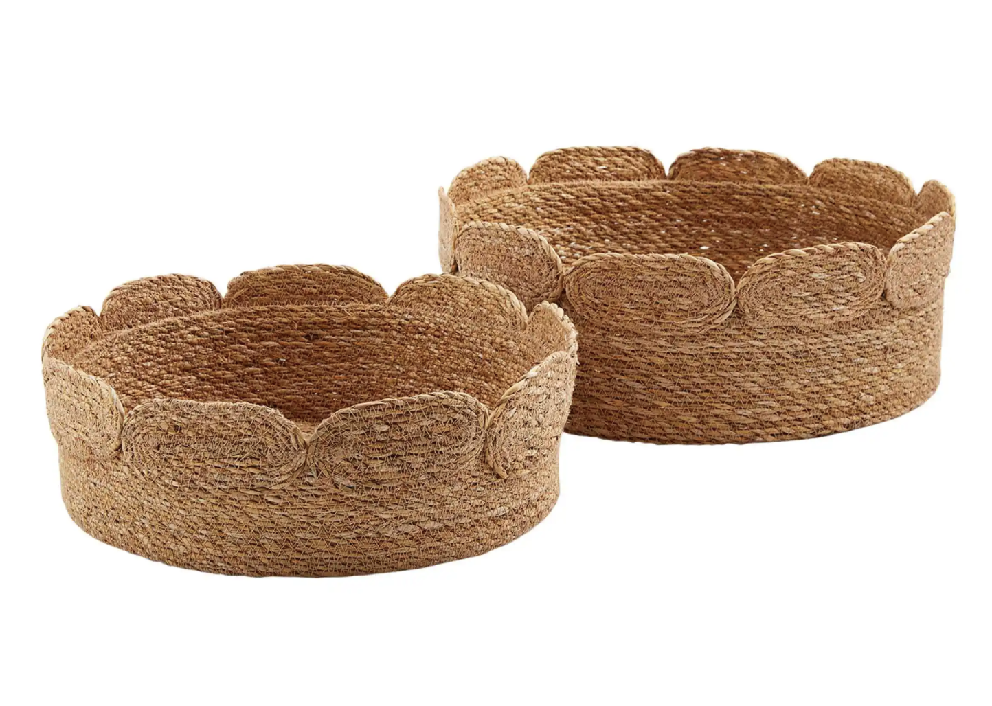 - This Scalloped Basket Set is the picture perfect decorative piece for your home. The nested set comes with two scalloped jute baskets. When not in use, simply store the smaller basket in the larger basket. These baskets are the perfect accessory for your kitchen - fill with kitchen essentials.