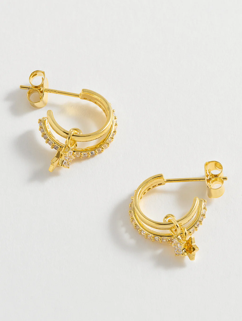 Go for a celestial look with our Duo Pave Star Hoops. Featuring two mini hoops adorned with tiny stones and dainty star drop charms, these earrings add sparkle to your style. Wear with our CZ Moon Necklace for a complete look.