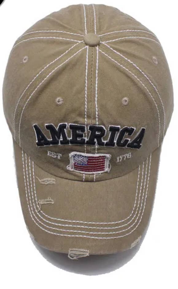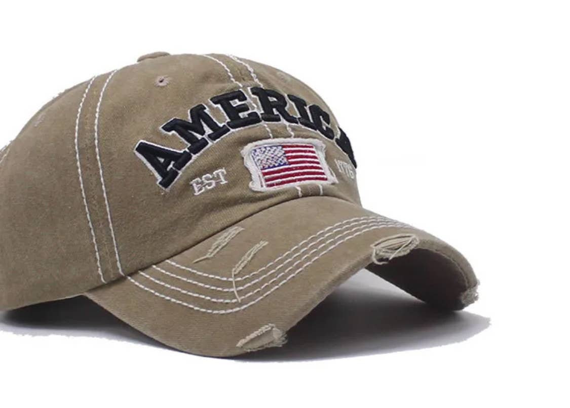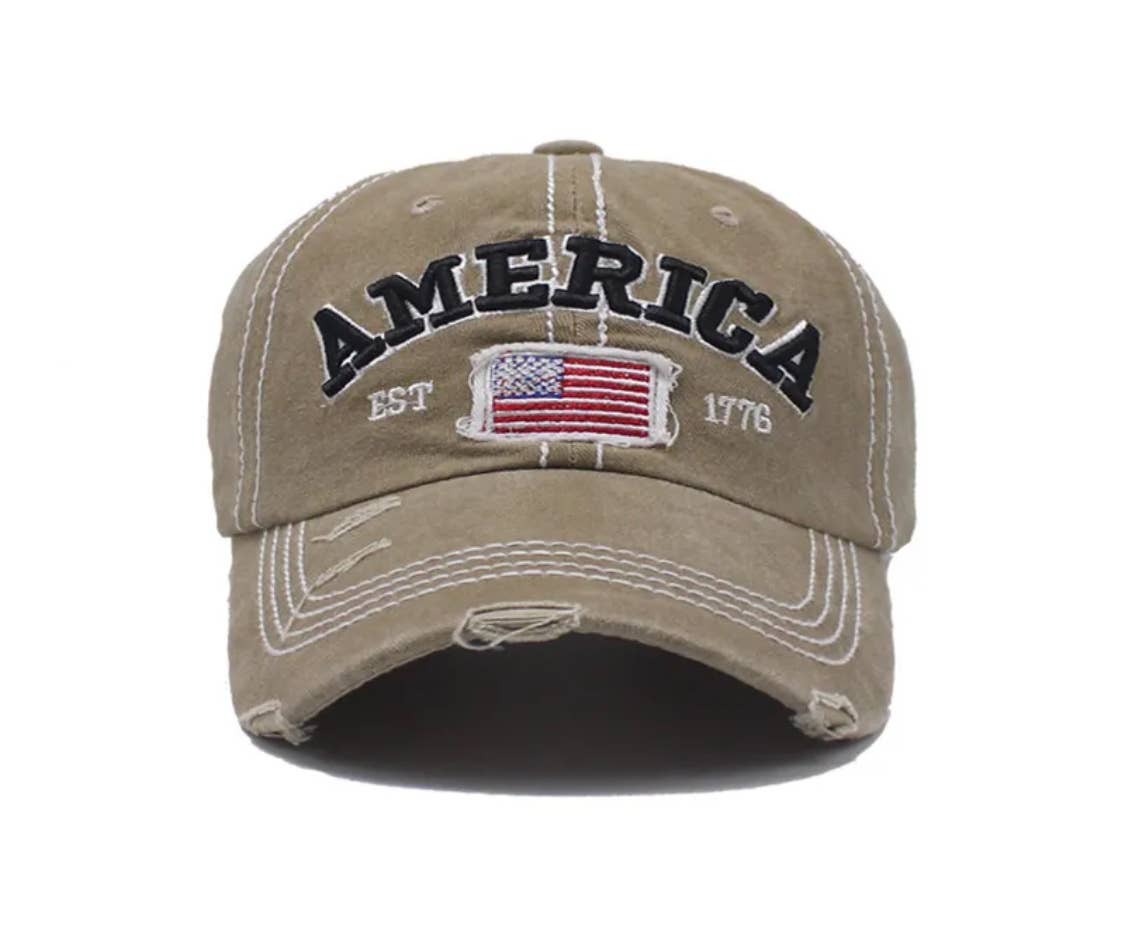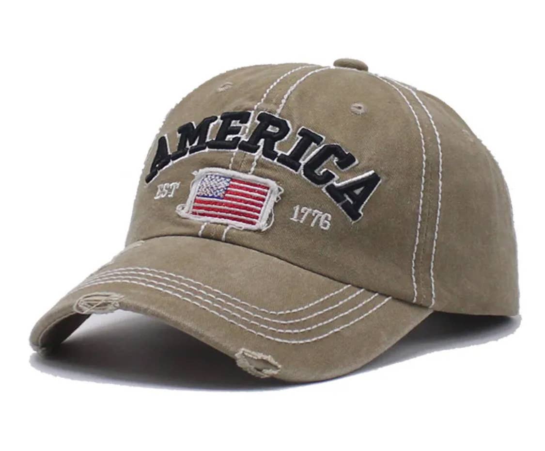 America EST 1776 baseball cap. Features a US Flag and rustic design. Equipped with an adjustable strap. Adorable