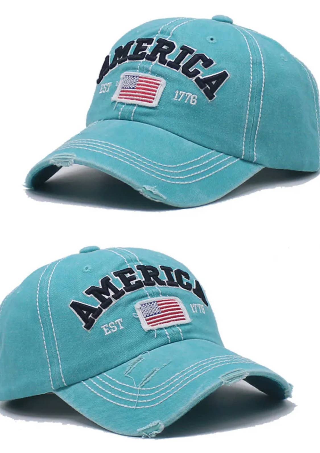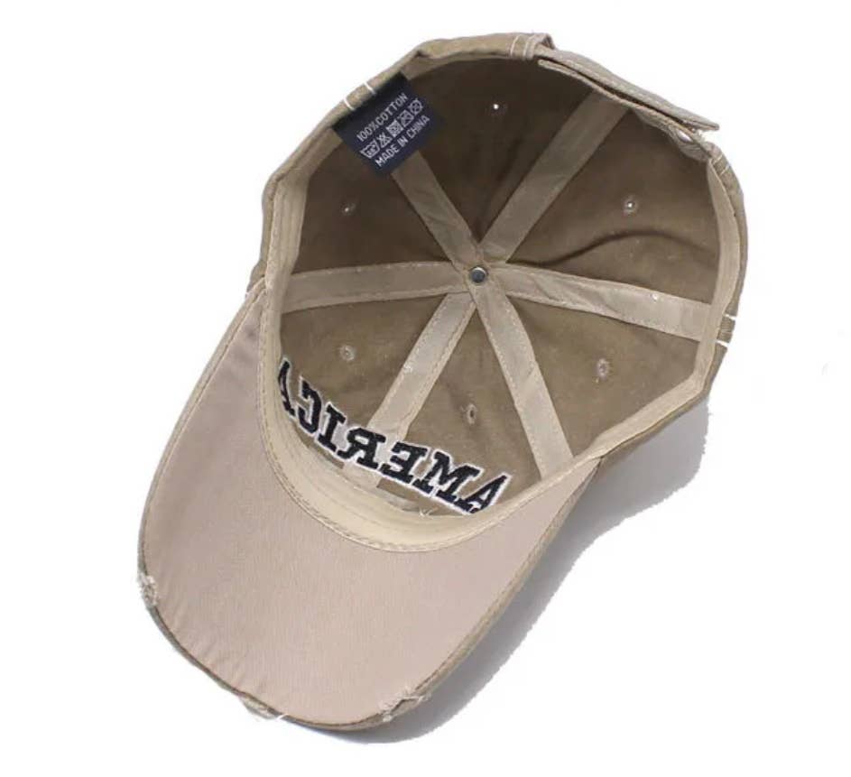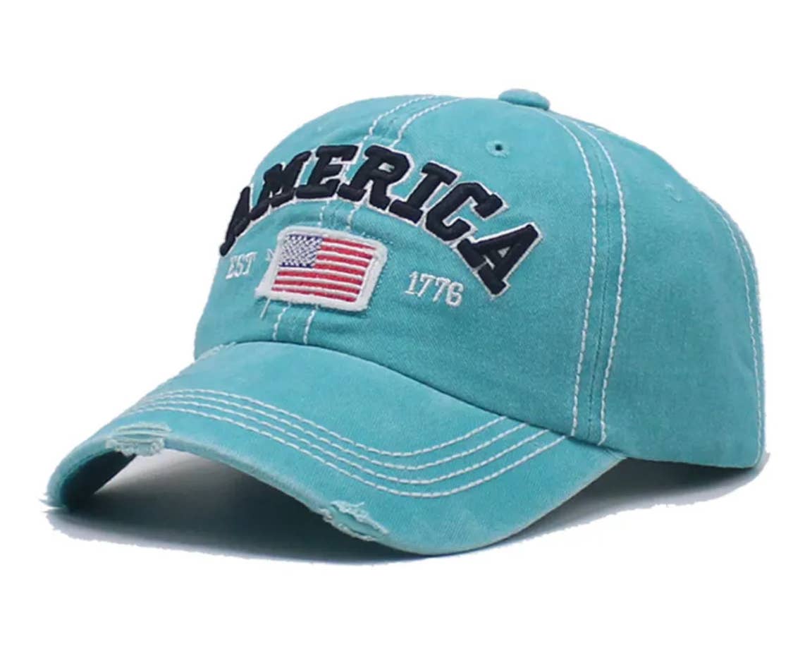 America EST 1776 baseball cap. Features a US Flag and rustic design. Equipped with an adjustable strap. Adorable