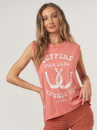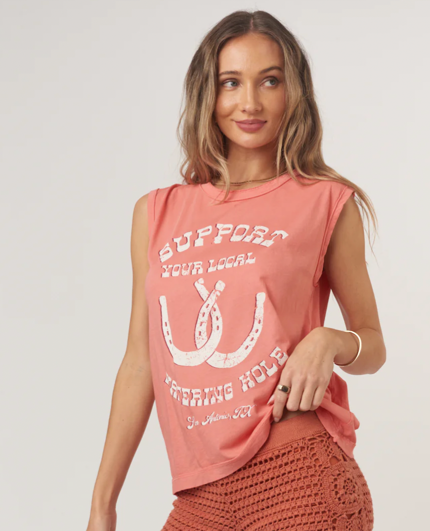 Support Your Local Watering Hole Tank is a bright muscle-style tank with a Western-inspired graphic across the front. Featuring distressed horseshoes and bold lettering, the vintage-style print gives it a worn-in, well-loved feel.