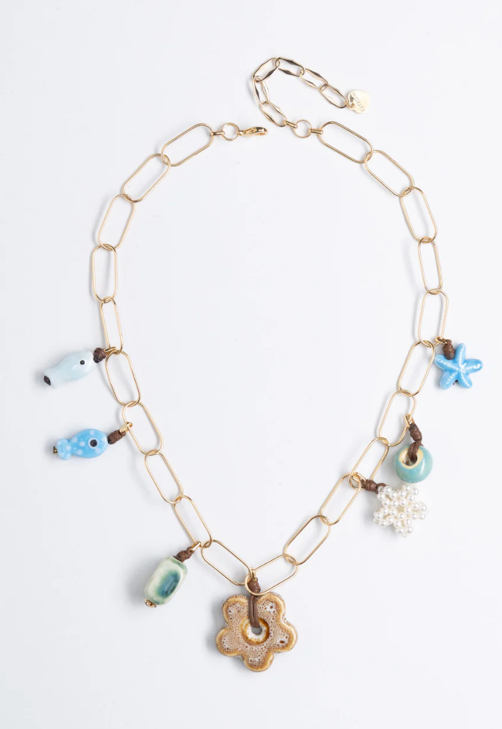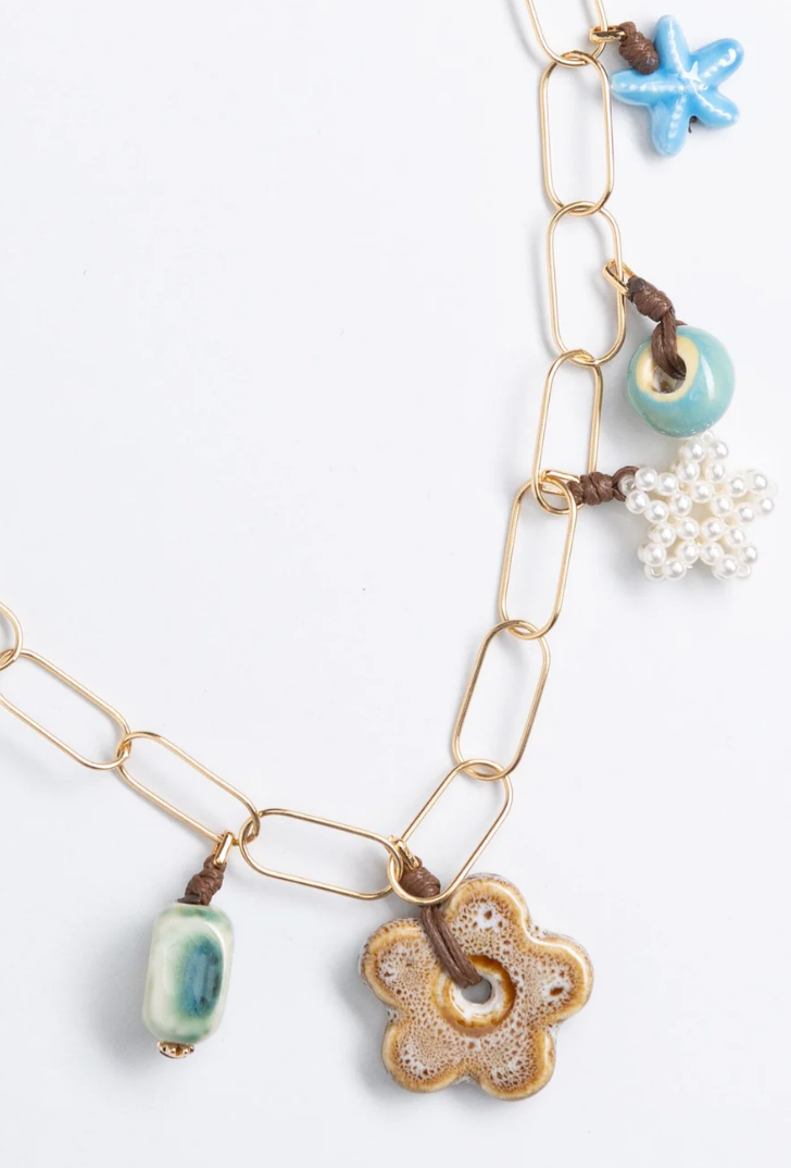 Add a touch of whimsical summer to your outfit game. Made with gold chain link, and adorable summer charm accents, this necklace is perfect for adding a pop character. Bring a happy, warm vibe wherever you go with this charming piece.