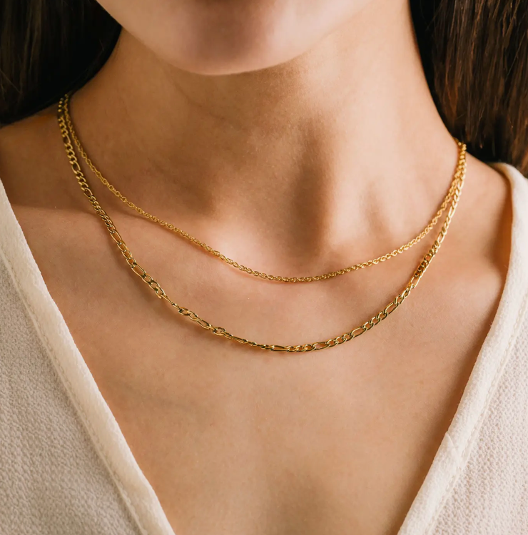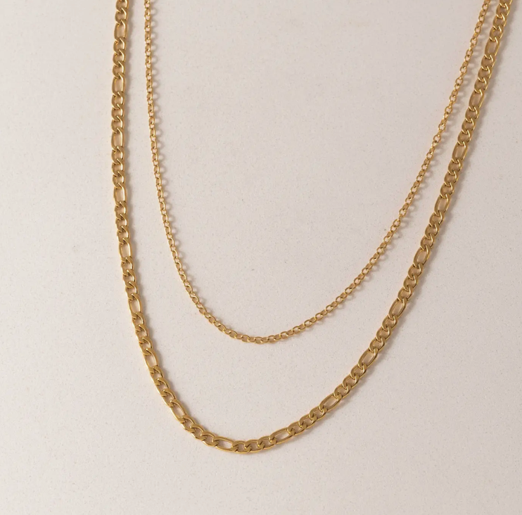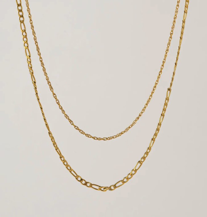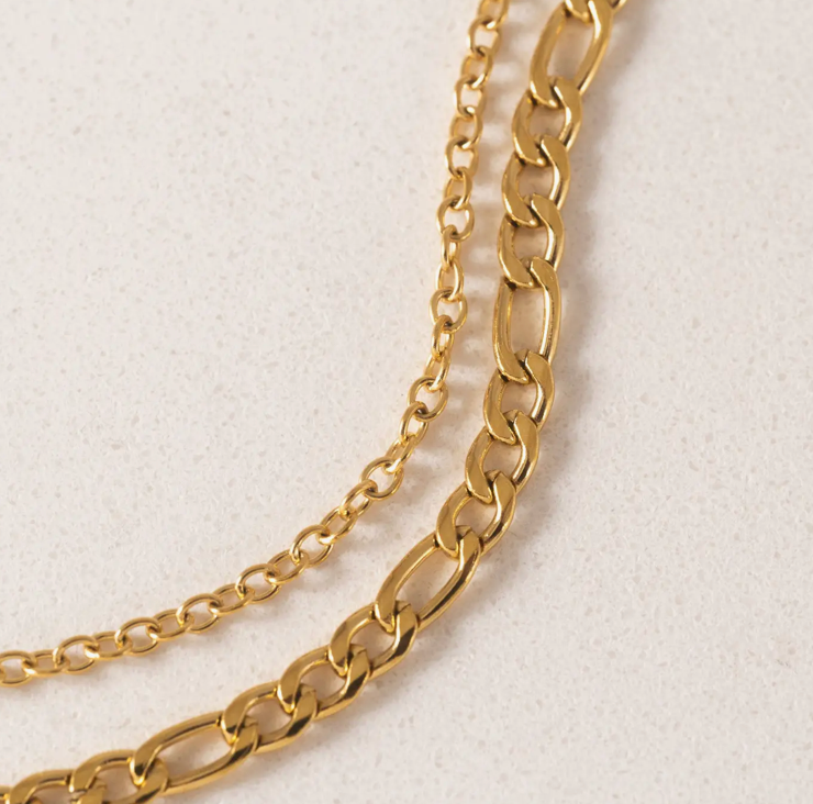 The Bobbi Necklace is a double duty necklace that sets the tone for easy styling and sophistication. This is a layered link and chain necklace crafted from 316L stainless steel with an 18K gold PVD finish, featuring two fixed chains for a balanced, dimensional silhouette. Created to simplify styling, it provides waterproof durability and tarnish resistance for reliable, everyday wear. Perfect as a layered gold necklace for customers who want a styled, put-together look without the need to stack multiple pieces. Key Features: * Fixed double chain design for effortless layering * Waterproof, tarnish-resistant, and hypoallergenic * 316L stainless steel with durable 18K gold PVD finish * Adjustable extender for flexible fit and styling * Lightweight construction for comfortable daily wear Construction & Materials: * Made In: China * Materials Used: 316L Stainless Steel, 18K Gold PVD * Chain Lengths: 16.5" and 18.5" * Extender Length: 2" * Finish: Polished gold-tone surface * Care: Waterproof and low maintenance, wipe clean after wear