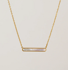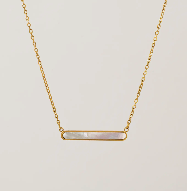 The Tofino Necklace is a gorgeous bar necklace holding a sleek shell bar pendant. This is a pendant necklace crafted from 316L stainless steel with 18K gold PVD, featuring a slim bar pendant in natural shell on a waterproof chain. Created for minimal, versatile wear, it offers a tarnish-resistant finish that allows customers to enjoy an easy, refined necklace without special care. Perfect as a minimalist shell pendant necklace for customers who want a subtle coastal accent that layers effortlessly or stands alone. Key Features: * Slim bar pendant featuring natural shell detailing * Waterproof, tarnish-resistant, and hypoallergenic * Crafted from 316L stainless steel with 18K gold PVD * Lightweight design ideal for layering or solo wear * Designed for daily wear, travel, and effortless styling Construction & Materials: * Made In: China * Materials Used: 316L Stainless Steel, 18K Gold PVD, Natural Shell * Pendant Size: 0.15" x 1.05" (4 mm x 27 mm) * Chain Length: 18.5" (47.5 cm) * Care: Waterproof and low maintenance, wipe clean as needed