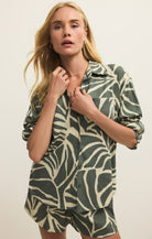This linen blend top makes any outfit look timeless with its button up style and palm print. Goes effortlessly with denim, linen, or its matching short.
