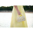 L 8.75" x W 3.5" x H 5"; hnd 2.75", chain 23"; pp and wood beads; gold hardware; detachable cross-body chain; magnetic snap closure; 1 inner slip pocket