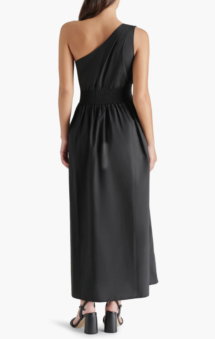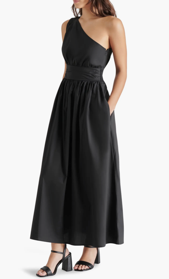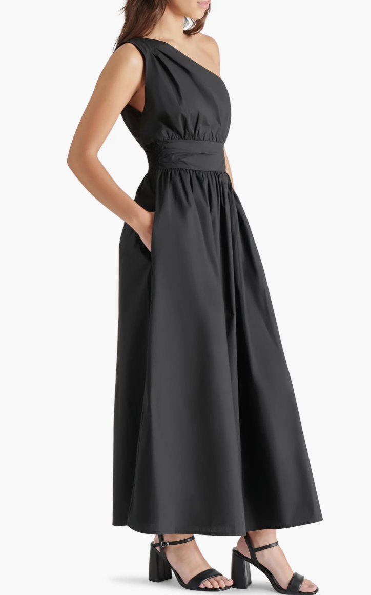 Keep your look effortlessly contemporary in this A-line cotton dress complete with an asymmetric neckline.