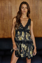 Woven Polyester Spandex Satin Plunged V Neck Sleeveless Tiered Flare Mini Dress with Lace Trim (No Lining)