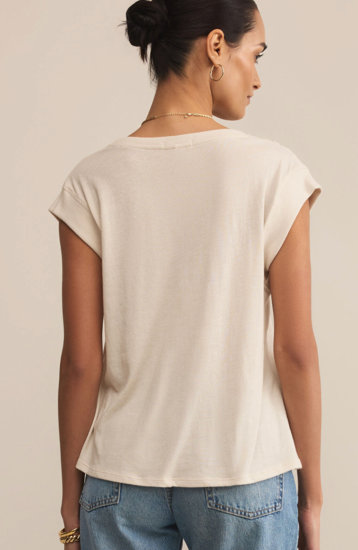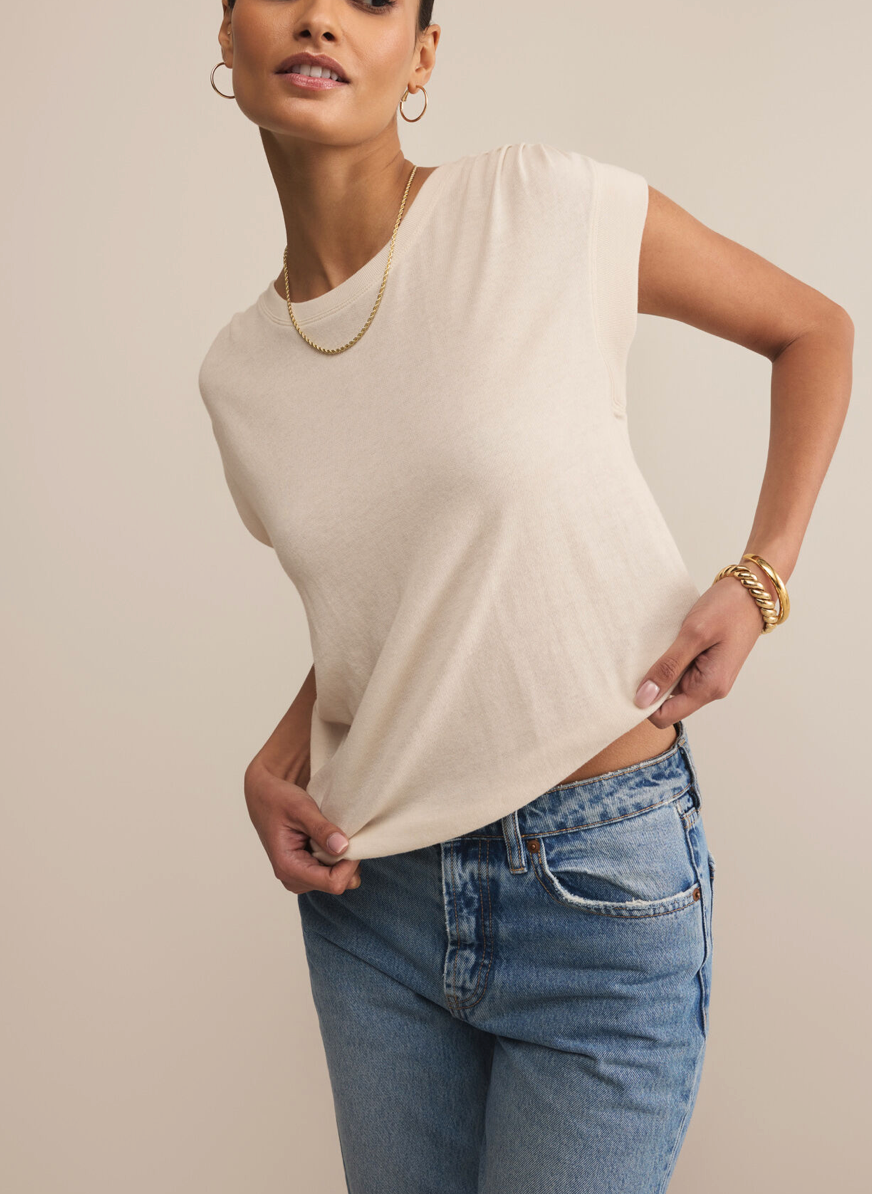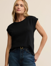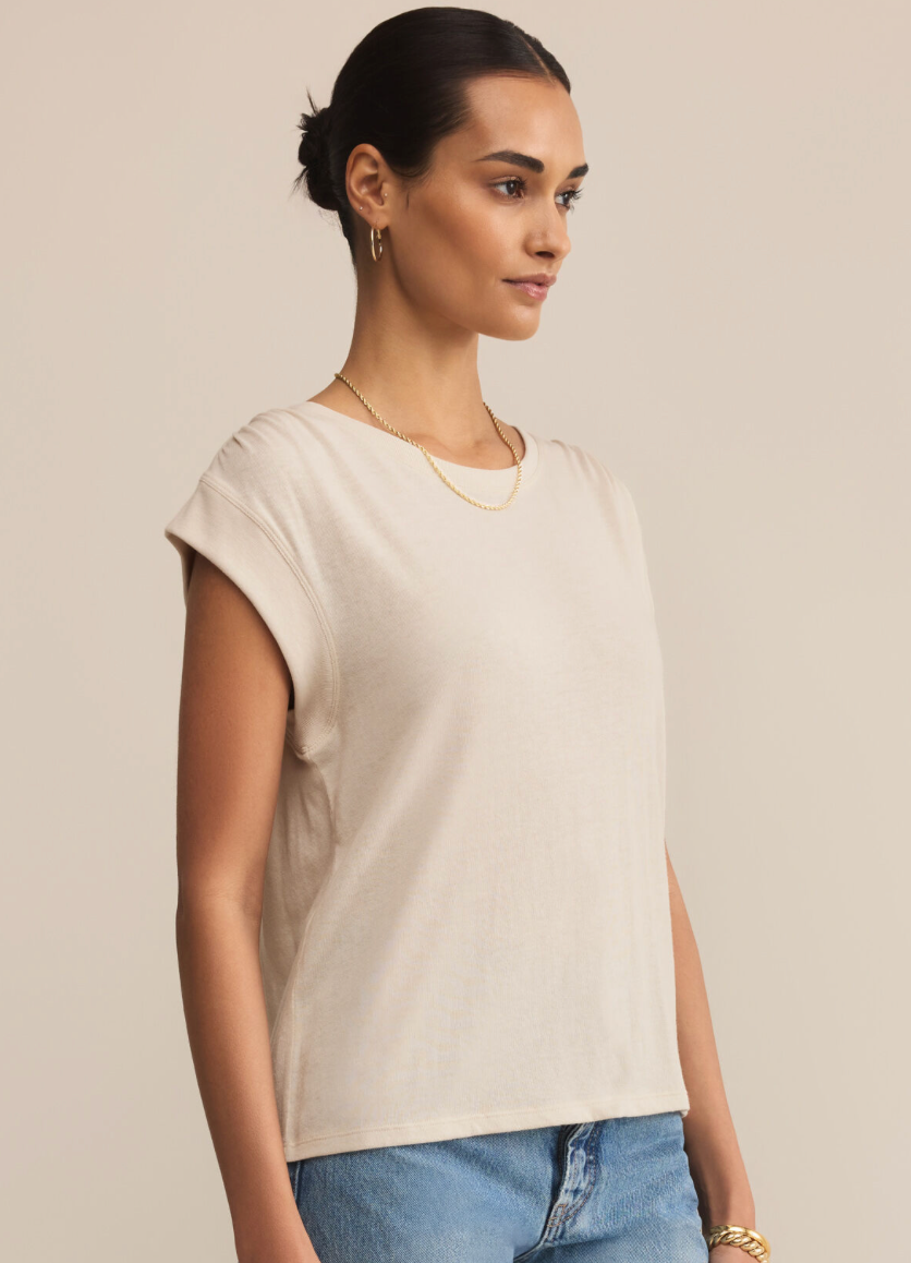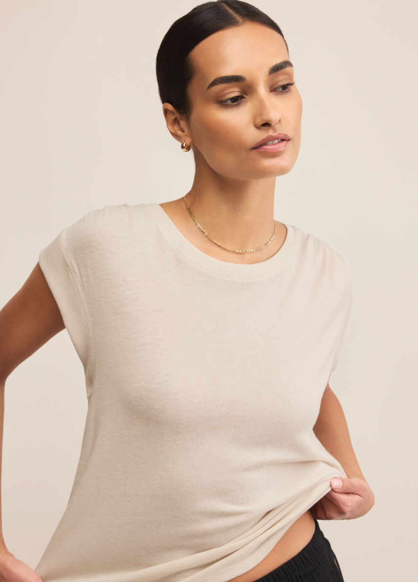 This slightly stretchy, soft top is made from our relaxed Whisper Knit Jersey, finished with subtle shirring at the shoulders for a feminine twist. With its easy body fit and crew neckline, it’s the kind of tee that always feels just right.