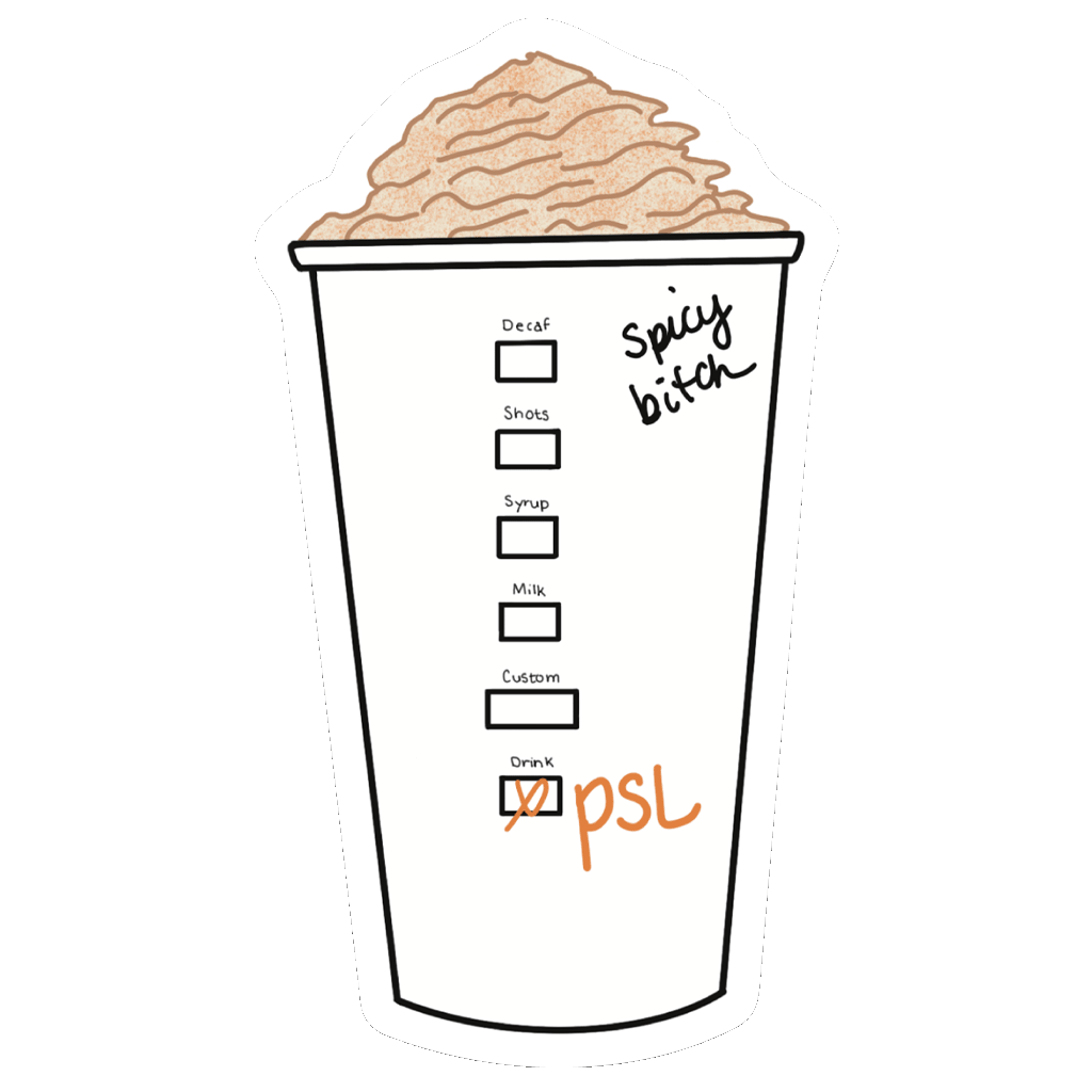 Vinyl die-cut sticker featuring a pumpkin spice latte and the phrase “spicy bitch” A humorous design with clean, bold lines. Funny sticker for journals, laptops, and Fall drink lovers.