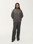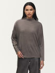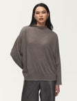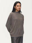 Oversized long sleeve mock neck top with long sleeves and metallic roll hem accents. Heather brown color.